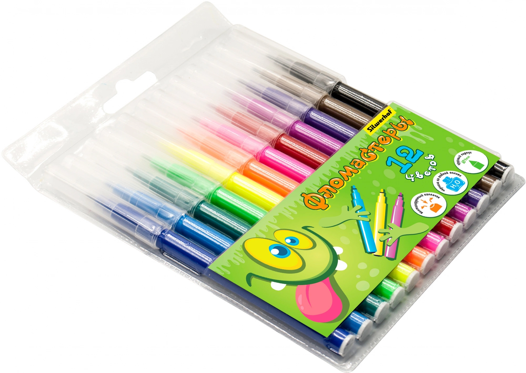 Фломастеры Silwerhof Монстрики 9мм 145мм круг. пулевидный пиш. наконечник Вентилируемый 12цв. пакет с европодвесом