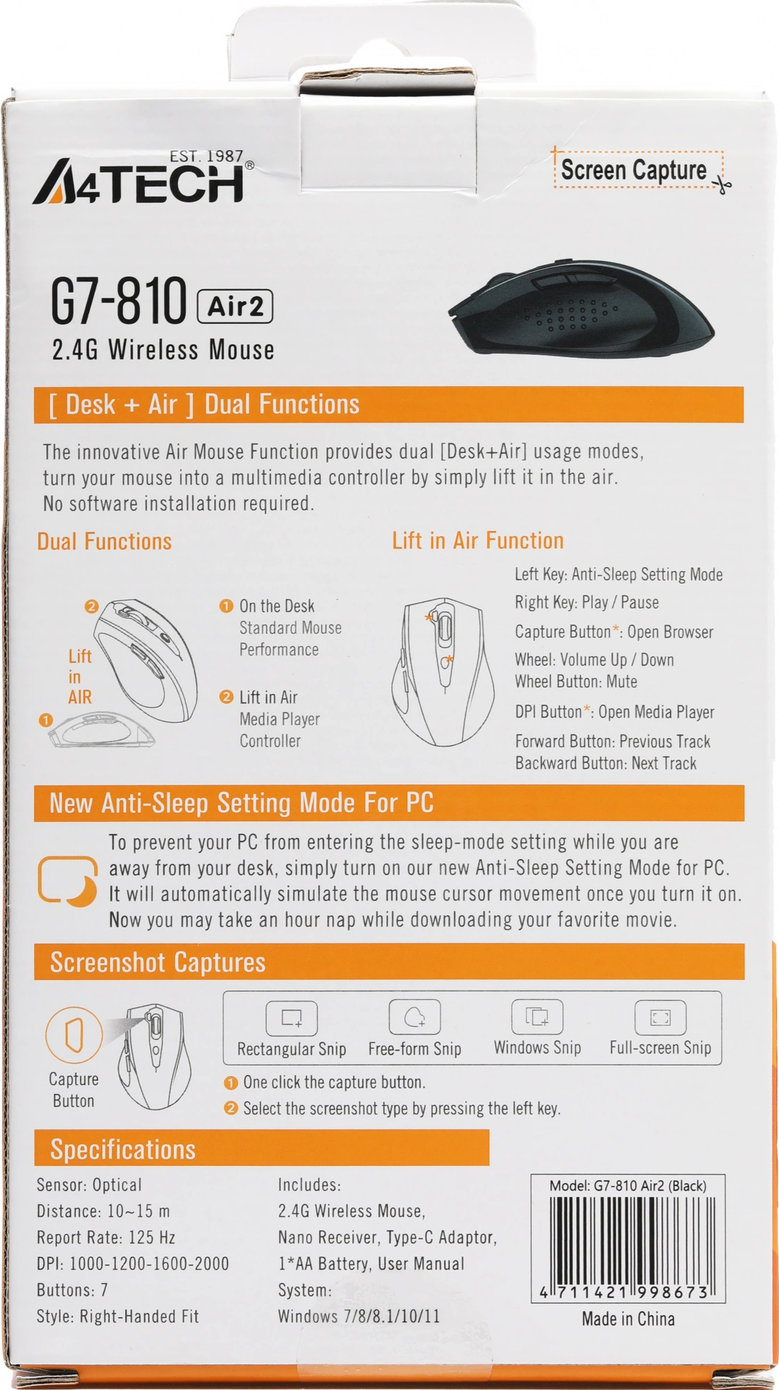 Мышь A4Tech G7-810 Air2 черный оптическая 2000dpi беспров. USB для ноутбука 7but