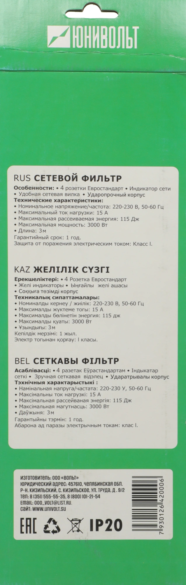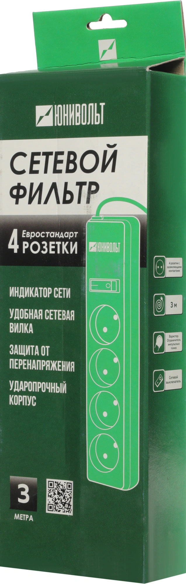 Сетевой фильтр Юнивольт 00-00000449 3м (4 розетки) белый (коробка)