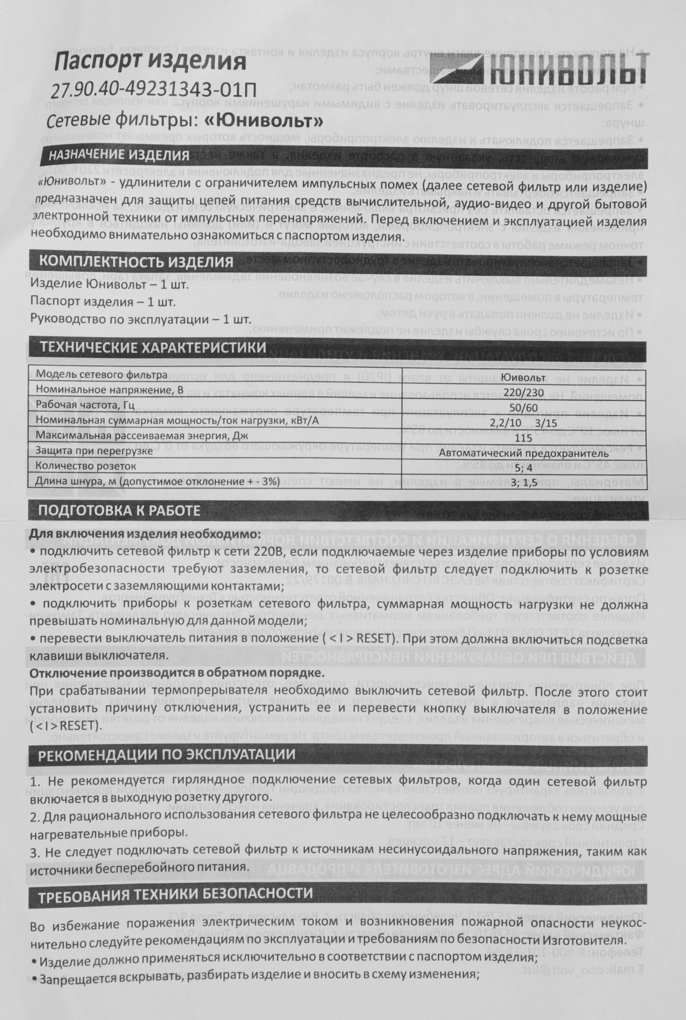 Сетевой фильтр Юнивольт 00-00000389 1.5м (5 розеток) белый (коробка)
