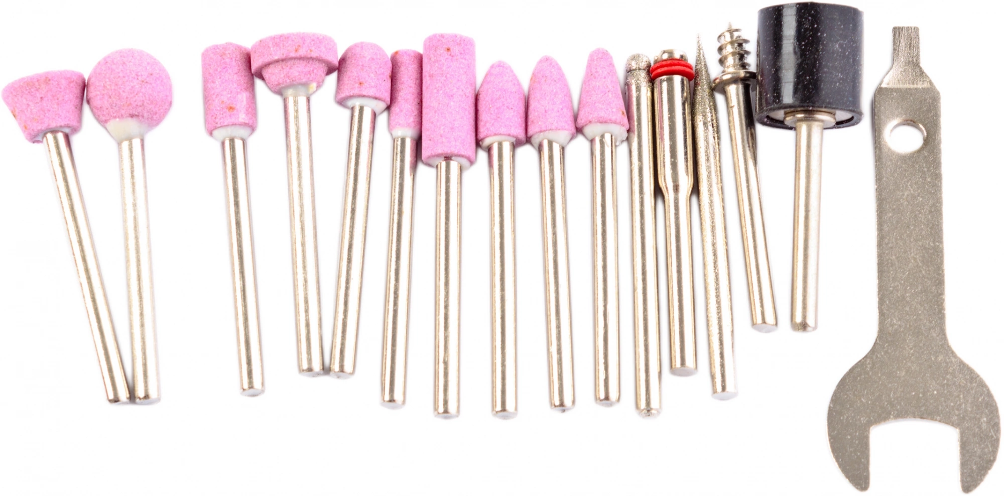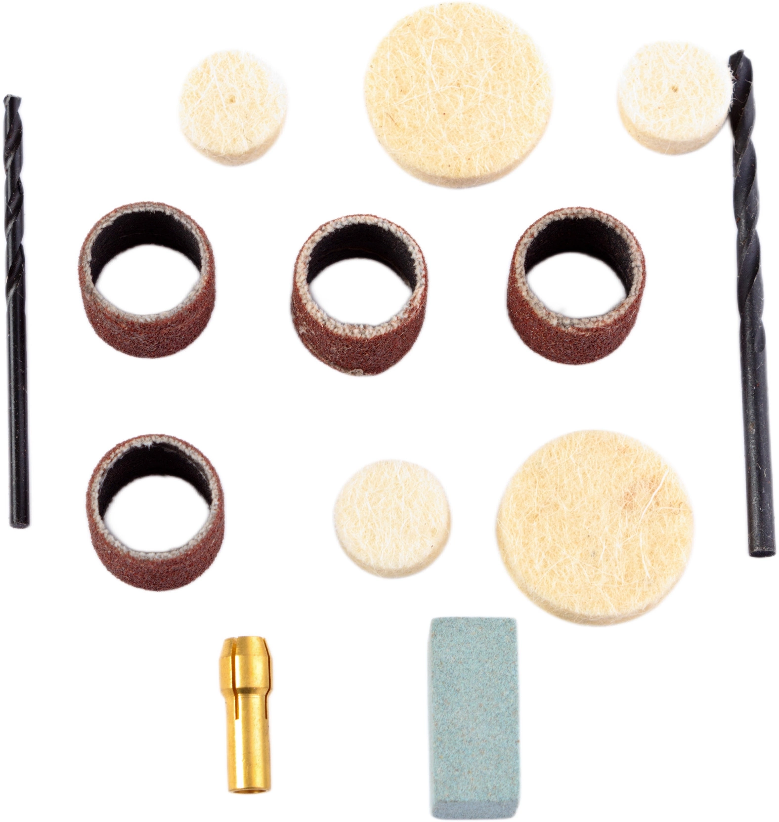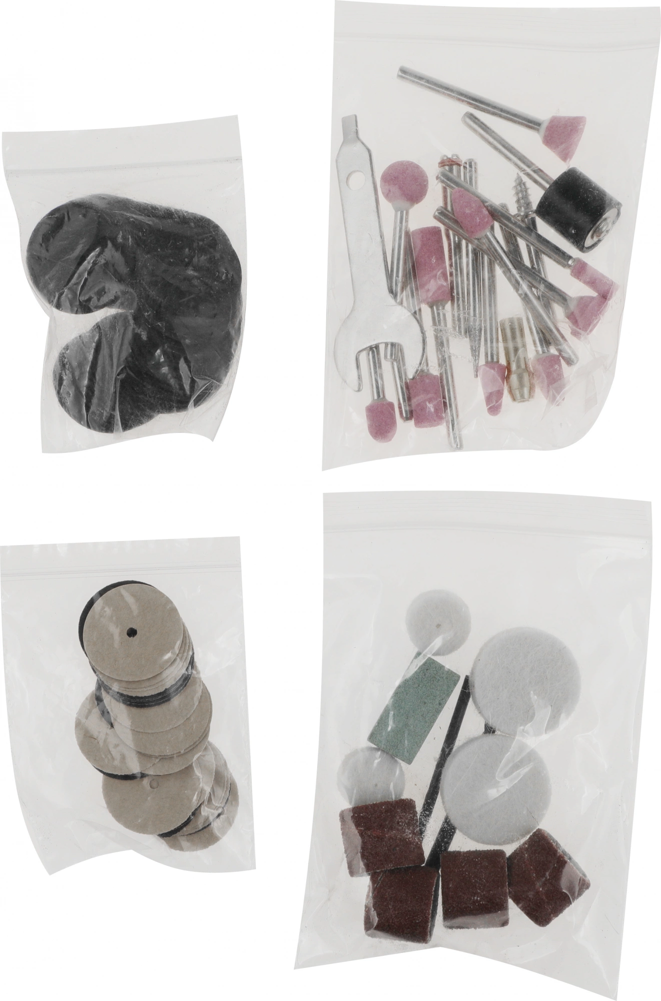 - НасадкиОтрезн. круги - 36 шт.; шлиф. бумага - 36 шт.; абразив. шлиф. головки - 10 шт.; держатель шлиф. лент с хвостовиком 3.2 мм.; шлиф. лента - 4 шт.; сверла - 2 шт.: 2.3/3.2 мм.; гравиров. резец - 2 шт..; держатели отрез. и полир кругов - 2 шт..; войлоч. полир. круг - 4 шт..