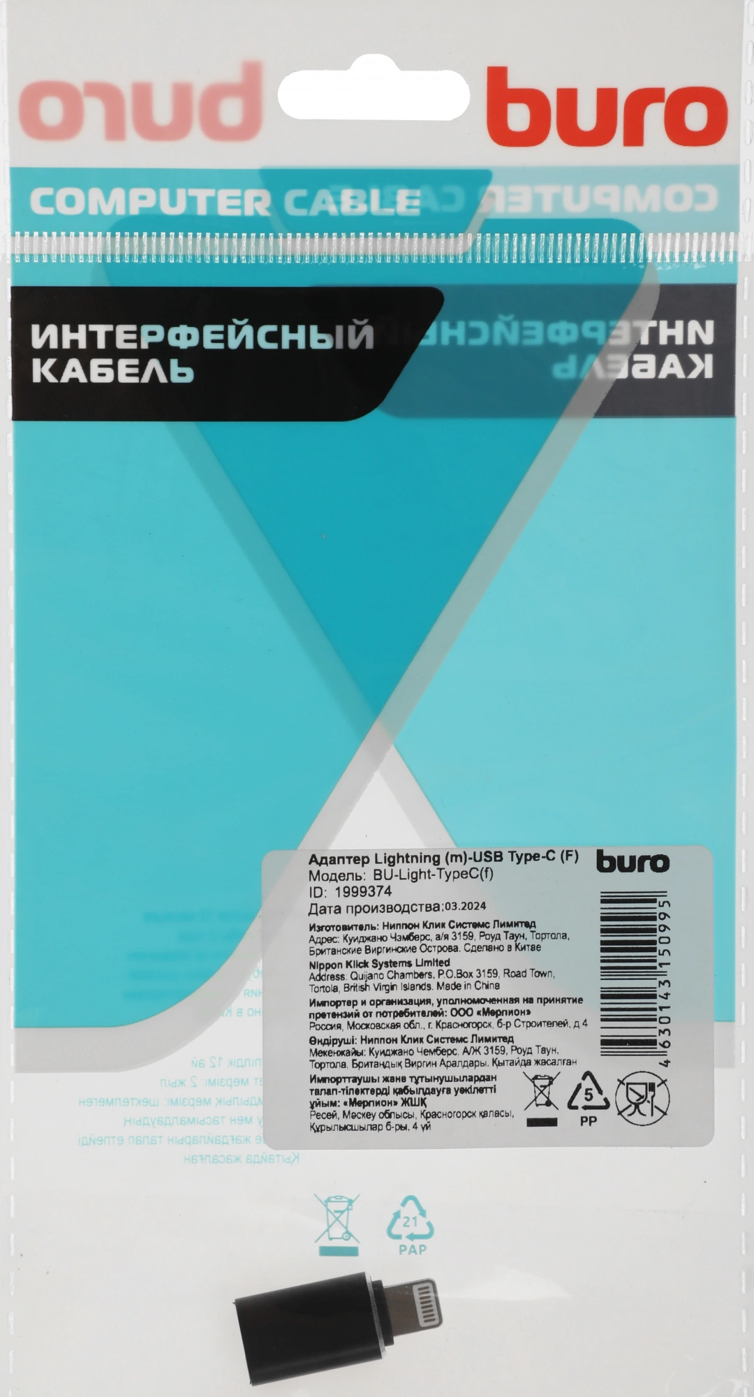 Переходник Buro BU-LIGHT-TYPEC(F) Lightning (m)-USB Type-C (F) черный