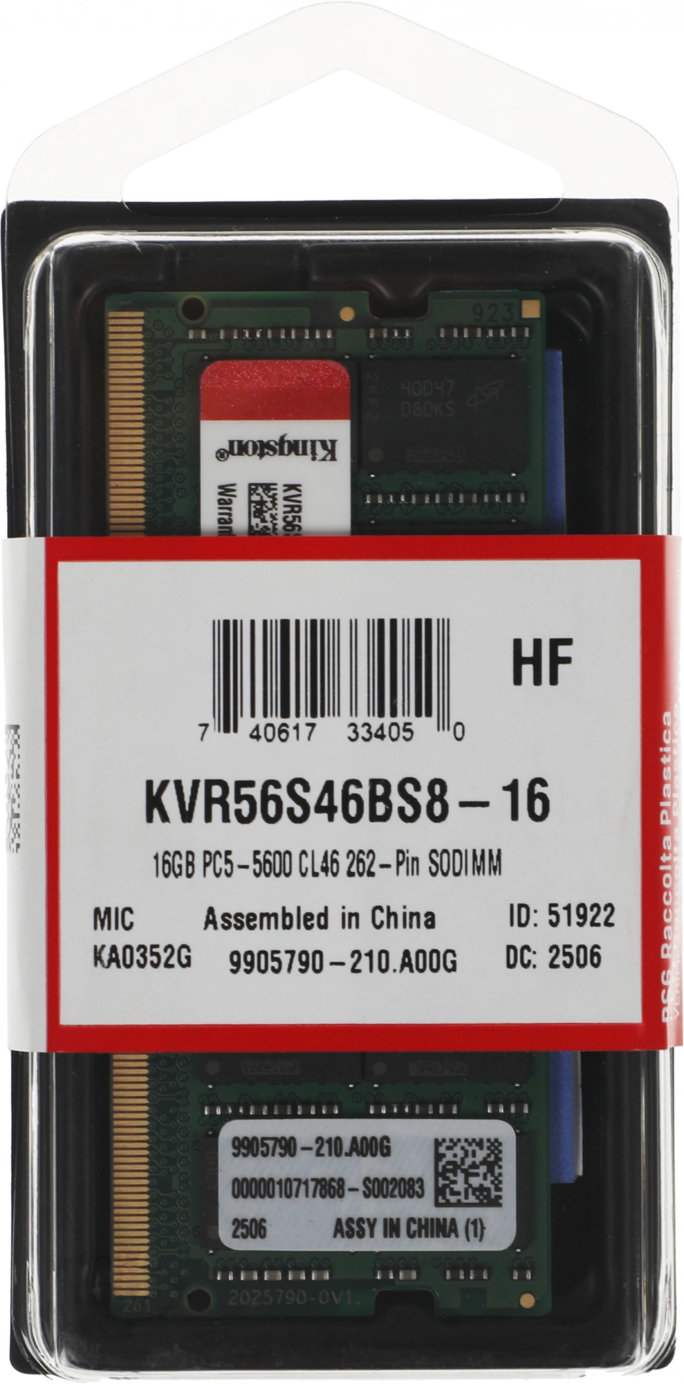 Память DDR5 16GB 5600MHz Kingston KVR56S46BS8-16 Valueram RTL PC5-44800 CL46 SO-DIMM 262-pin 1.1В single rank Ret