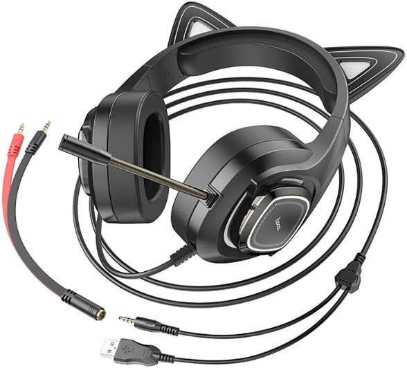 - ОсобенностиНаушники проводные, игровая гарнитура Hoco W107, светящиеся игровые наушники с кошачьими ушками. Оснащенный кабелем аудио-адаптера «один-два». Интерфейс: USB + 3,5 разъем