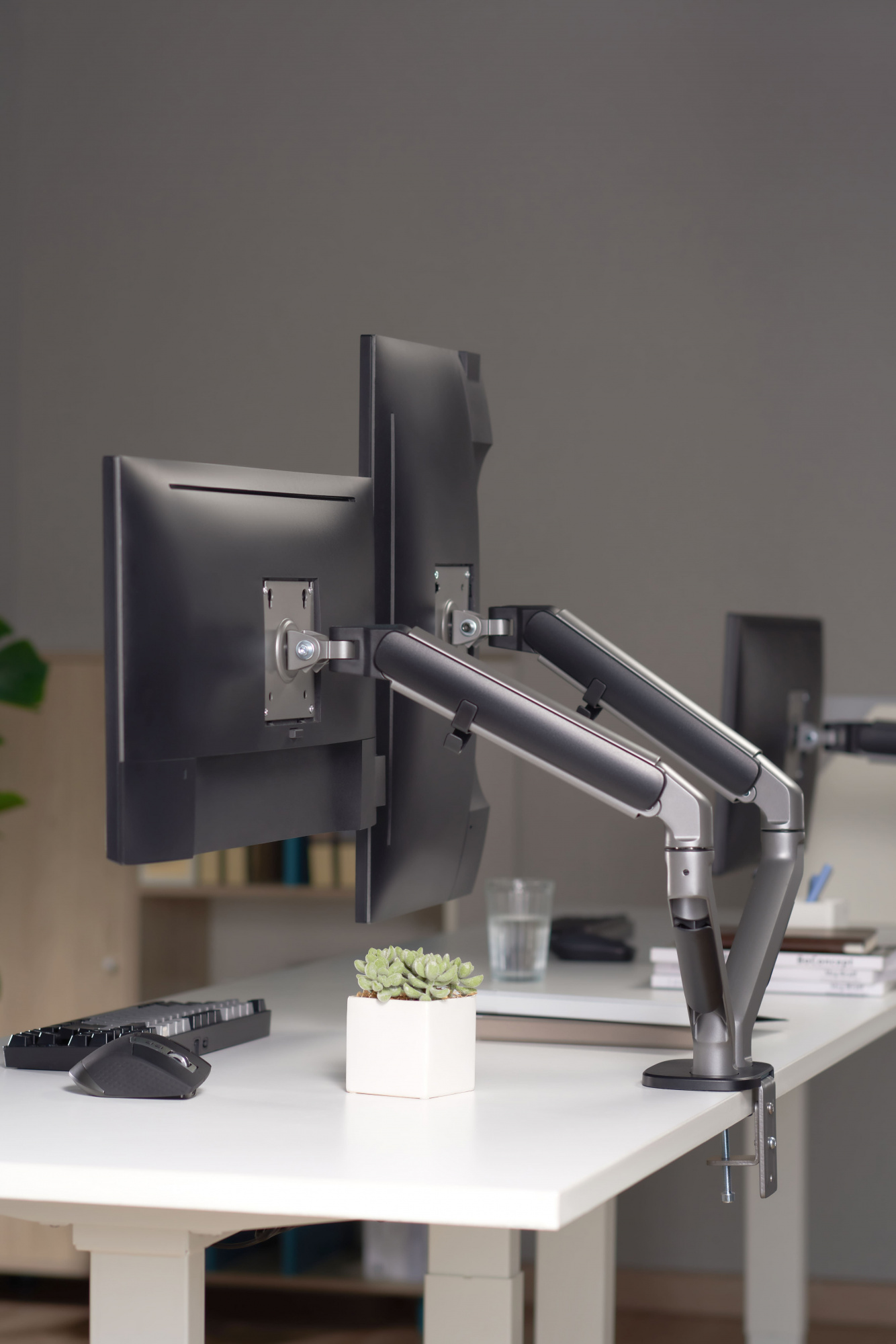- ОсобенностиНастольный кронштейн с двумя креплениями под мониторы. Встроенный пружинный механизм натяжения поможет для идеальной регулировки веса.