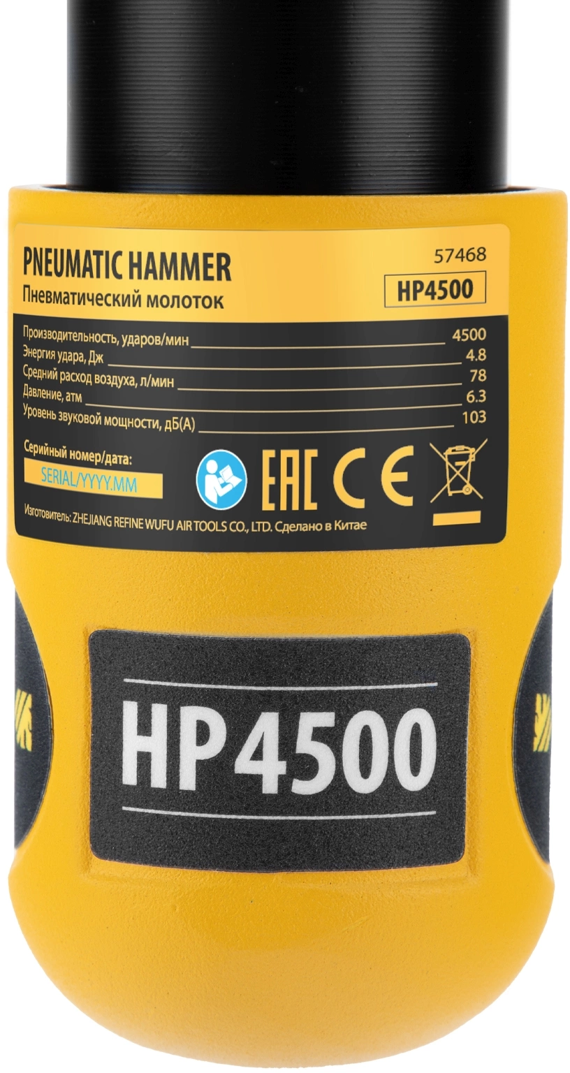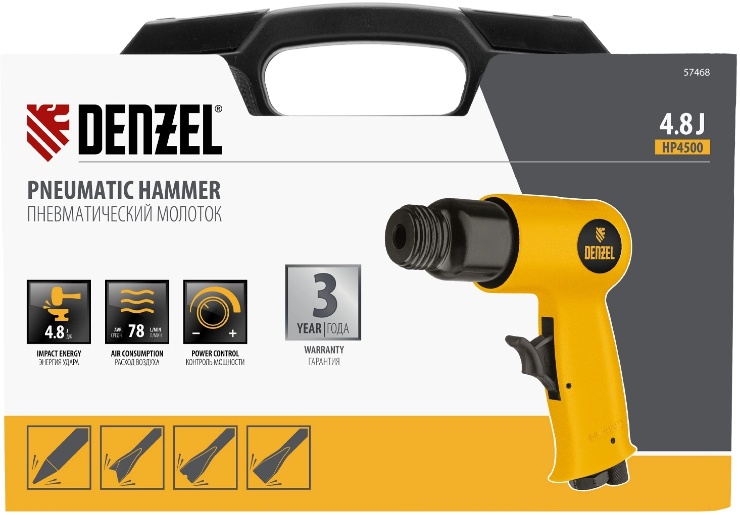 Пневматический молоток с набором насадок в комплекте, производительностью 4500 уд/мин, используется для резки, дробления конструкций и материалов из древесины, кирпича, камня или бетона. Благодаря высокой скорости работы подходит для профессионального использования.