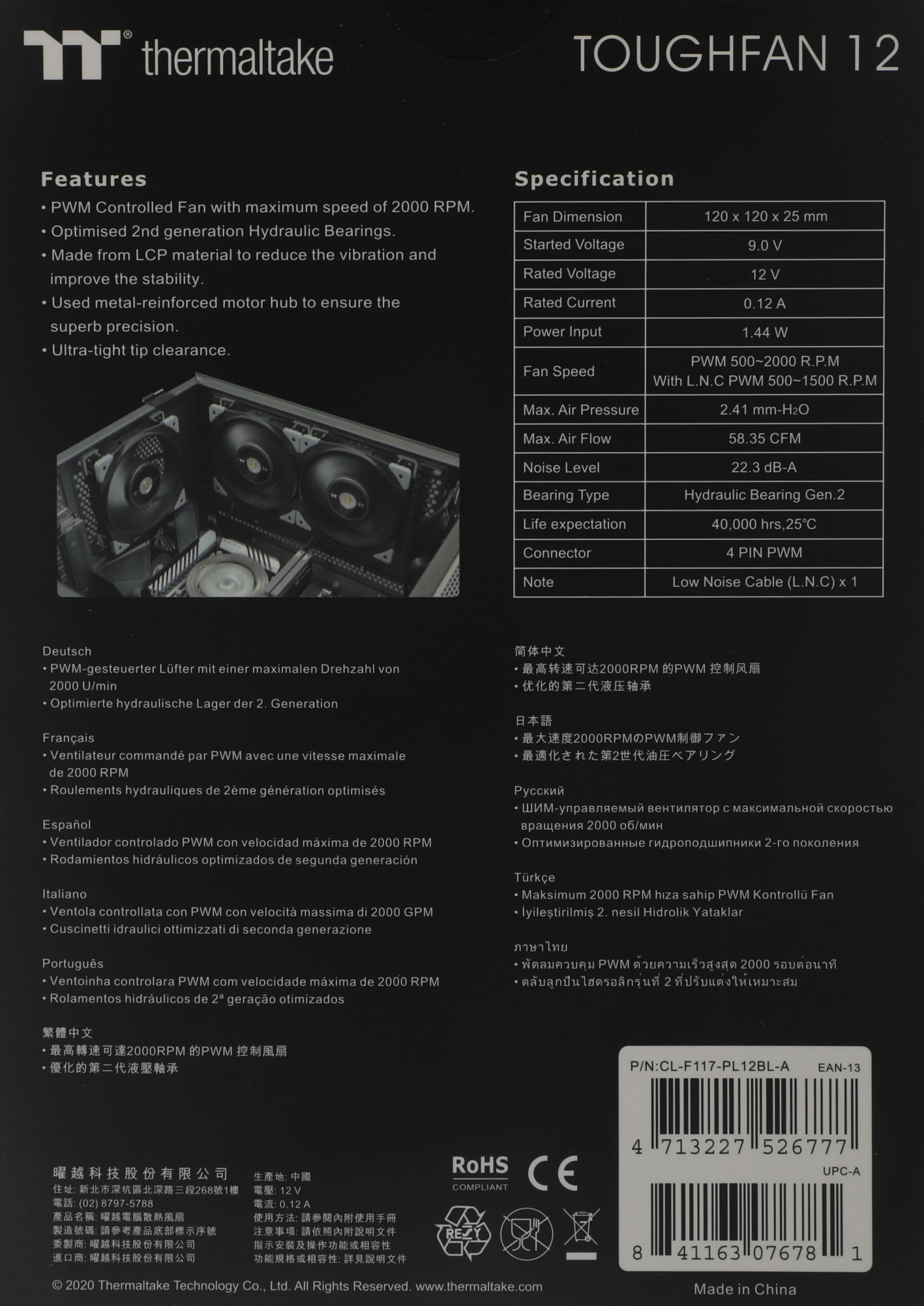 Вентилятор для корпуса Thermaltake Toughfan 12 120х120x25 черный 4-pin 22.3дБ (CL-F117-PL12BL-A) Ret
