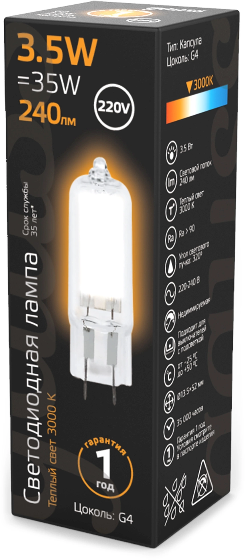 Лампа светодиодная Gauss G4 3.5Вт цок.:G4 капсул. 220B св.свеч.бел.теп. (упак.:10шт) (107807103)