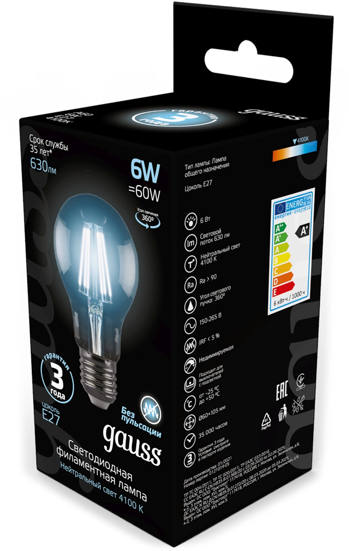 Лампа филам. Gauss Filament A60 6Вт цок.:E27 груша 220B св.свеч.бел.нейт. (упак.:10шт) (102802206)
