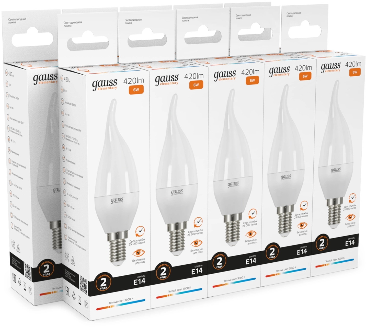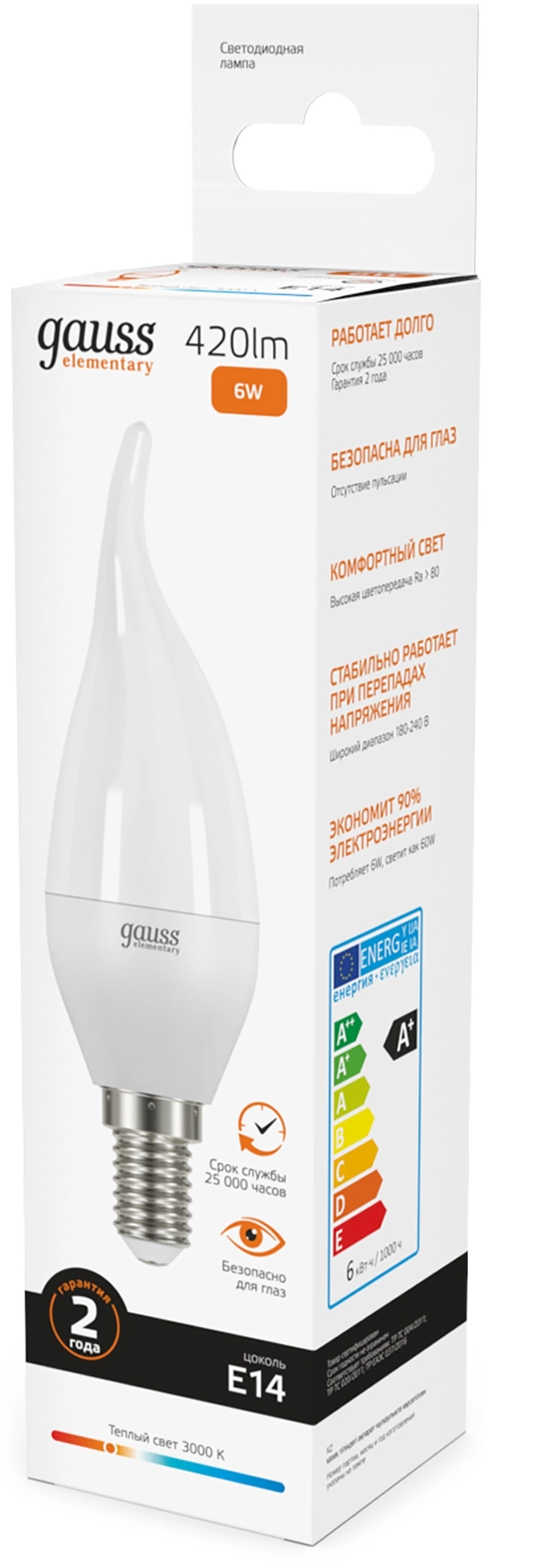 Лампа светодиодная Gauss Elementary 6Вт цок.:E14 свеча 220B св.свеч.бел.теп. (упак.:10шт) (34116)