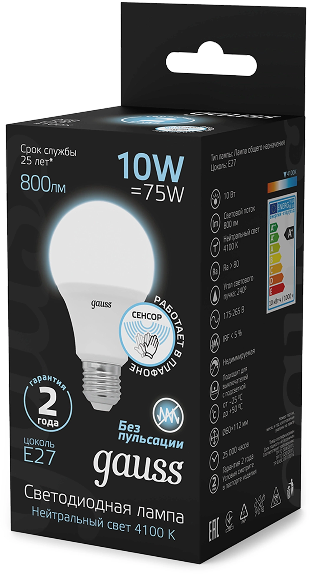 Лампа светодиодная Gauss 102502210-M 10Вт цок.:E27 груша 220B св.свеч.бел.нейт. A60 (упак.:10шт)