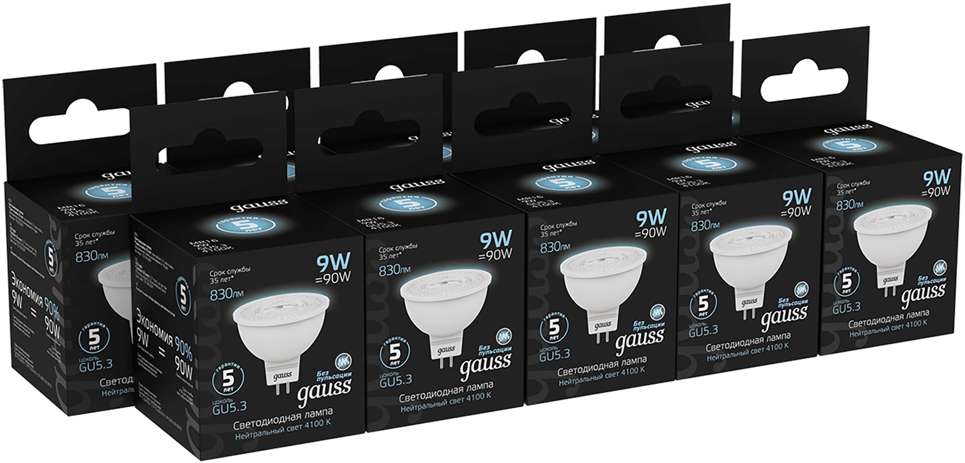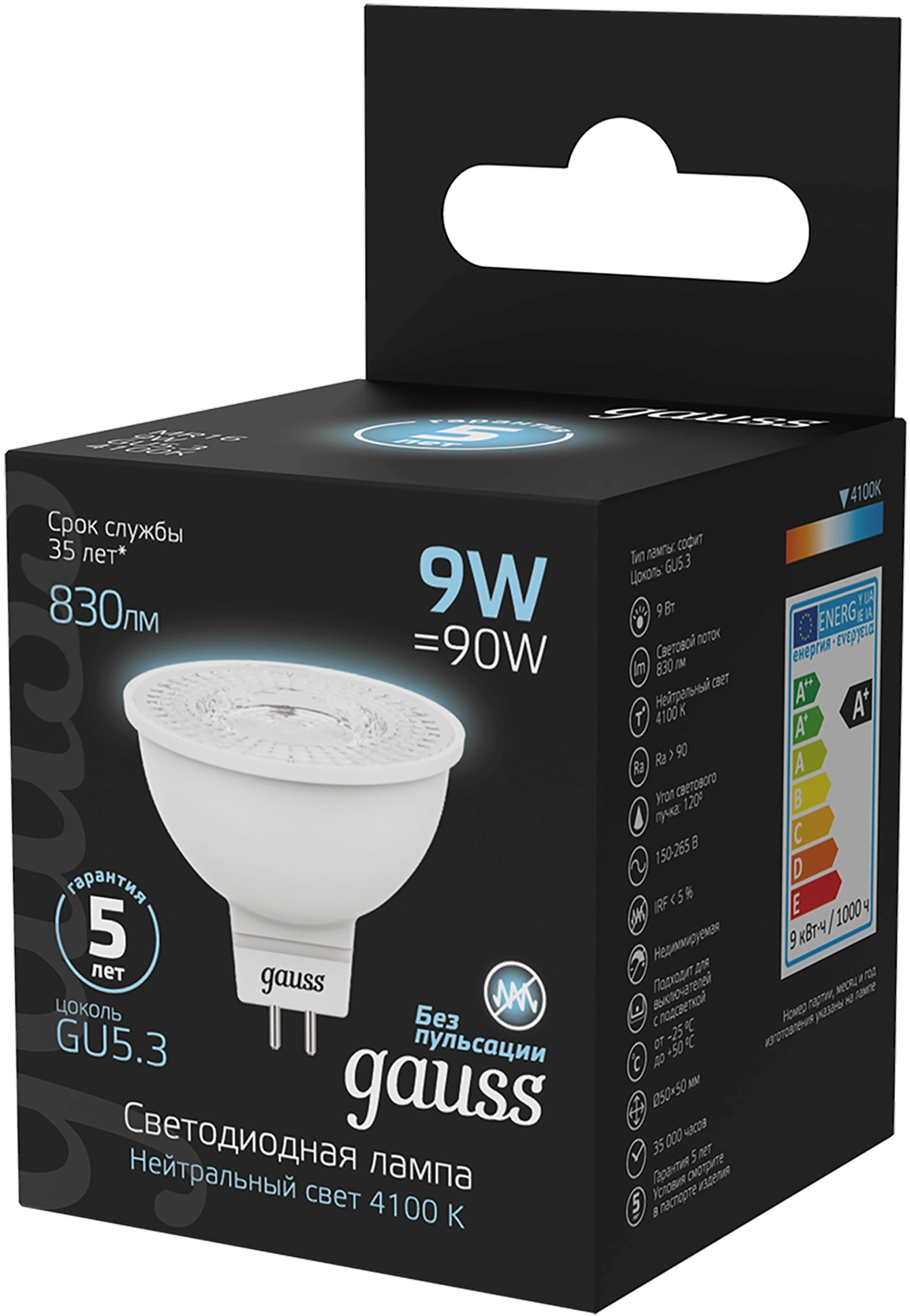 Лампа светодиодная Gauss 101505209 9Вт цок.:GU5.3 рефлек. 150B св.свеч.бел.нейт. MR16 (упак.:10шт)