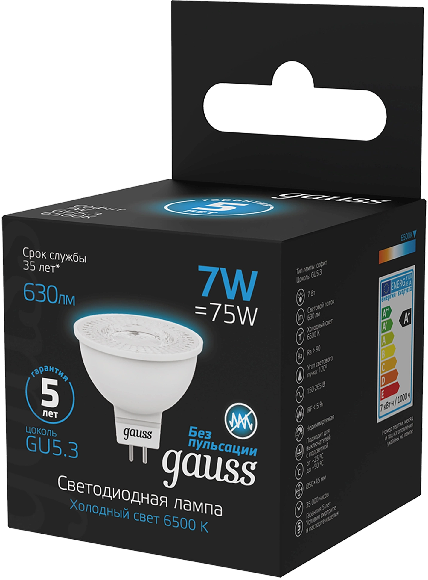Лампа светодиодная Gauss 101505307 7Вт цок.:GU5.3 рефлек. 220B св.свеч.бел.хол. MR16 (упак.:10шт)