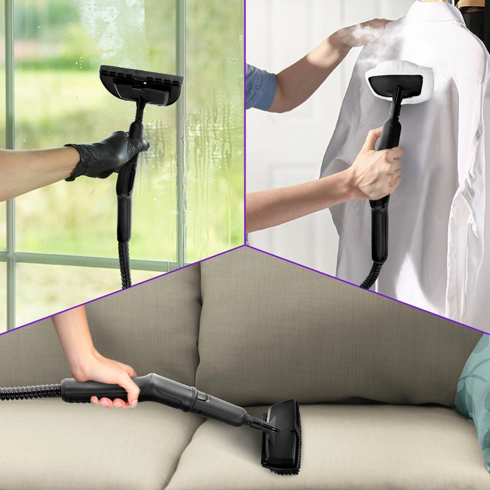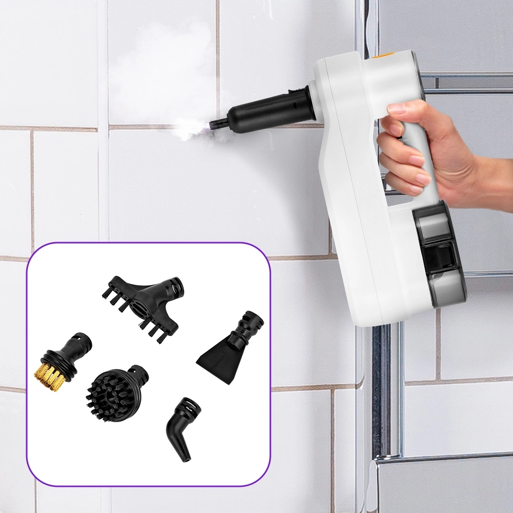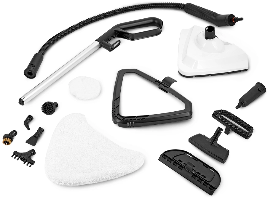 - Комплектациятряпка для пола, рамка для ковра, паровой шланг, струйная насадка, насадка для отпаривания с резиновым скребком, тряпка для отпаривания, скребок для стекла с резиновой вставкой, ворсовая щетка, угловая насадка, скребок, плоская нейлоновая щетка, круглая нейлоновая щетка, круглая латунная щетка