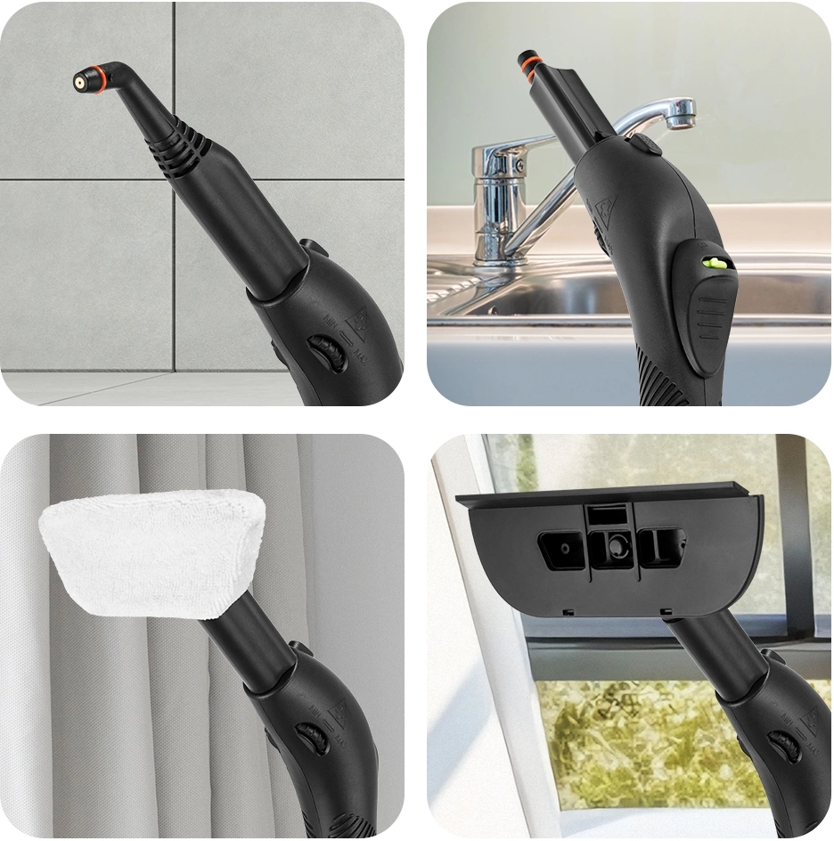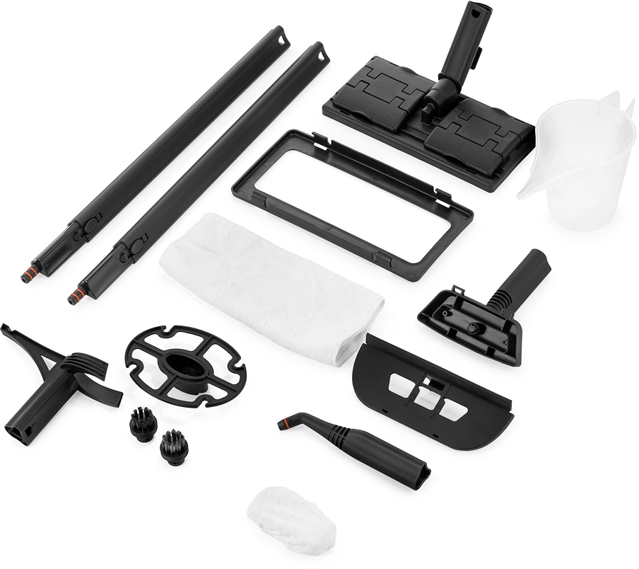 - Насадки в комплектенасадка для пола, тряпка для пола, рамка для ковра, нейлоновая щетка, стальная щетка, струйная насадка, держатель для вешалок, держатель шнура, насадка со скребком, насадка для отпаривания, тряпка для отпаривания