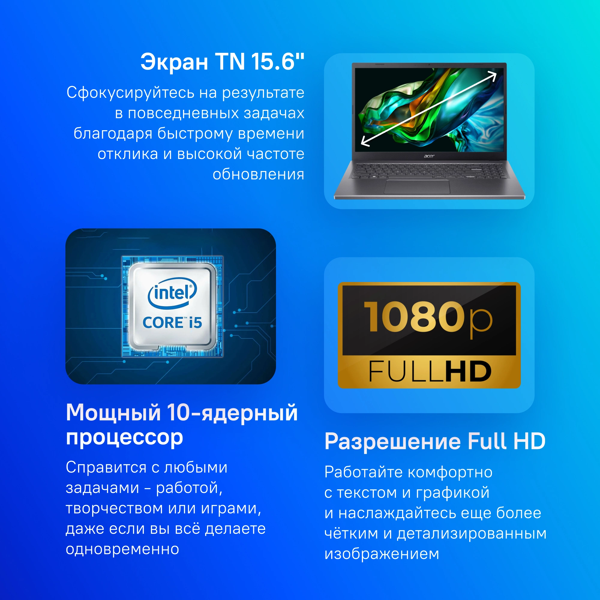 Ноутбук Acer Aspire 5 A515-58P-55K7 Core i5 1335U 8Gb SSD512Gb Intel Iris Xe graphics 15.6" TN FHD (1920x1080) без ОС silver WiFi BT Cam (NX.KHJER.004)