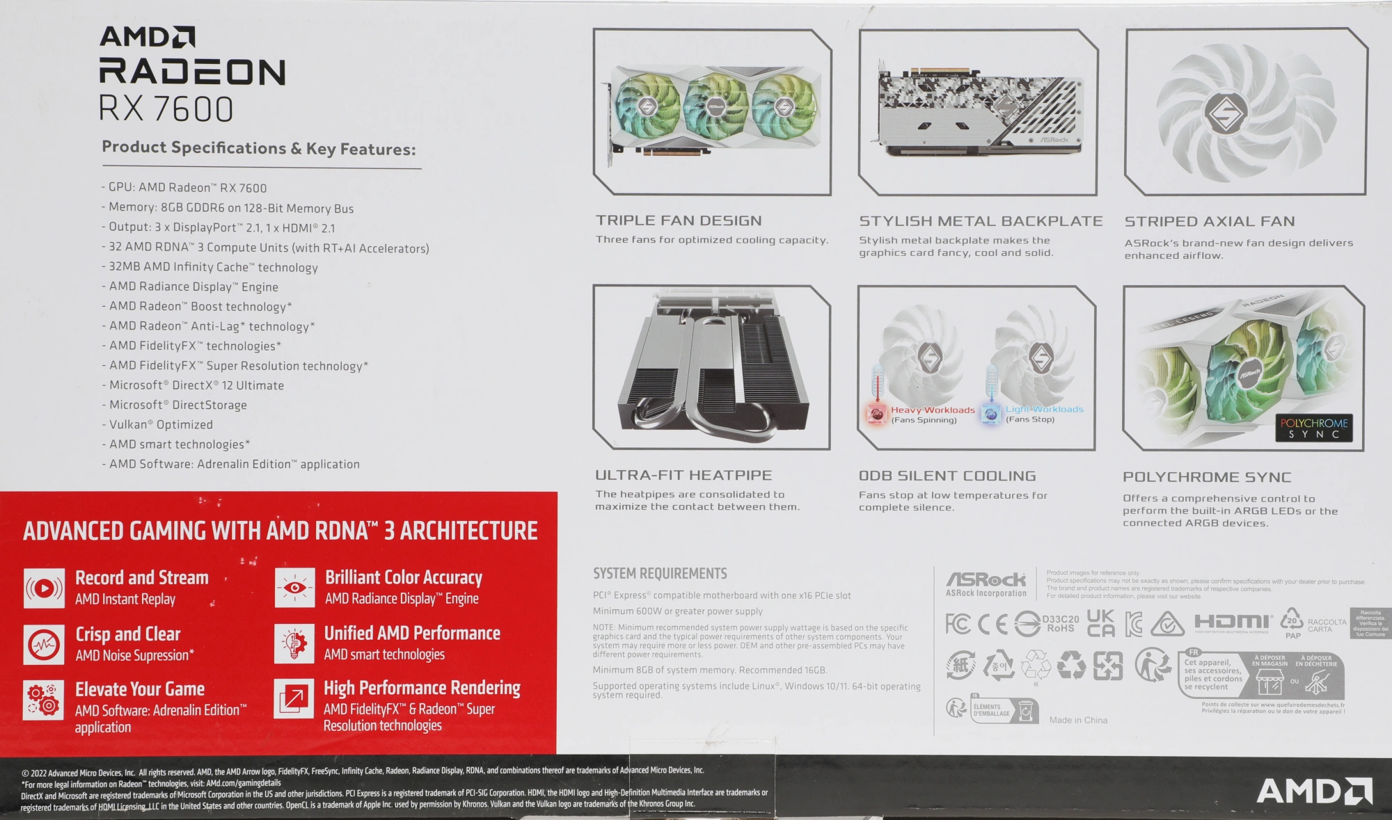 Видеокарта Asrock PCI-E 4.0 RX7600 SL 8GO AMD Radeon RX 7600 8Gb 128bit GDDR6 2320/18000 HDMIx1 DPx3 HDCP Ret