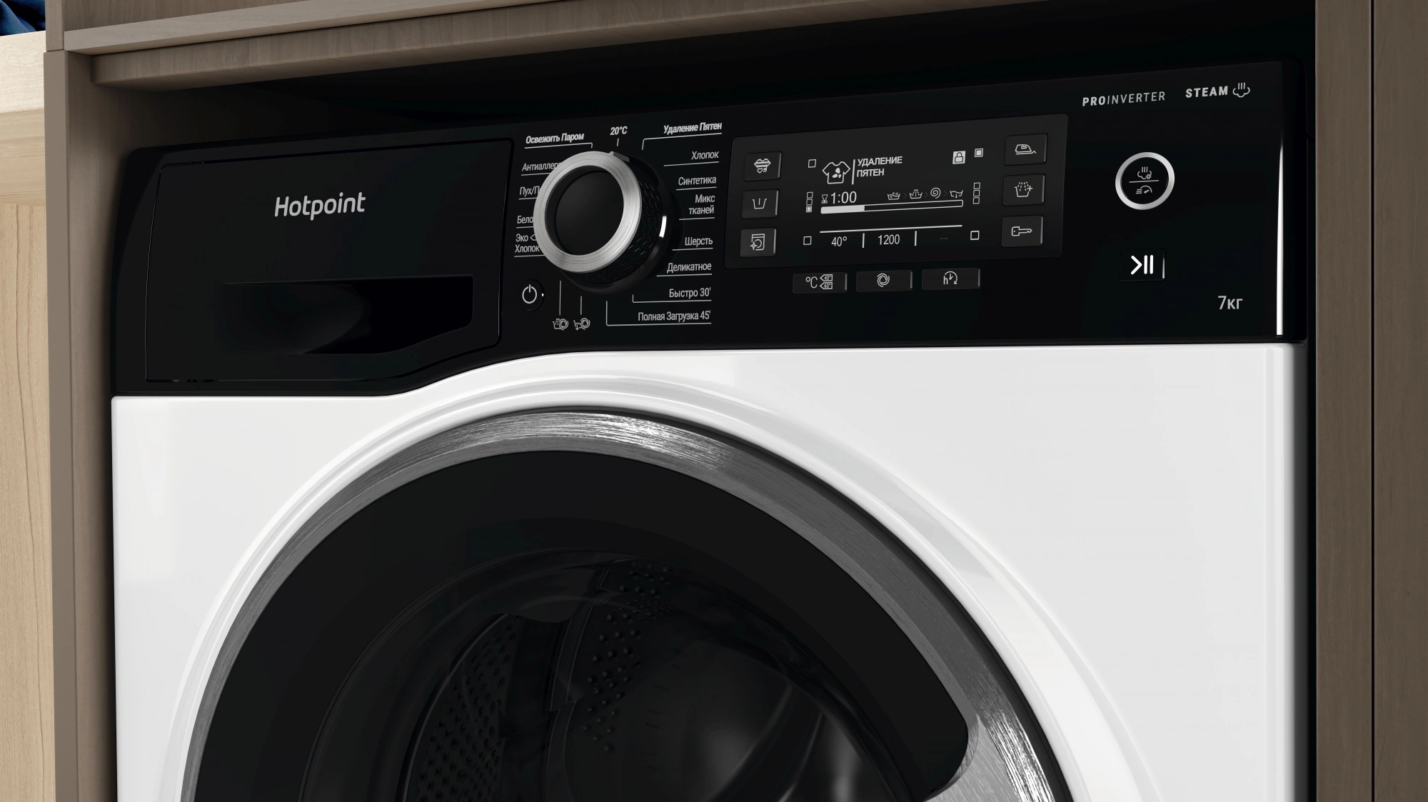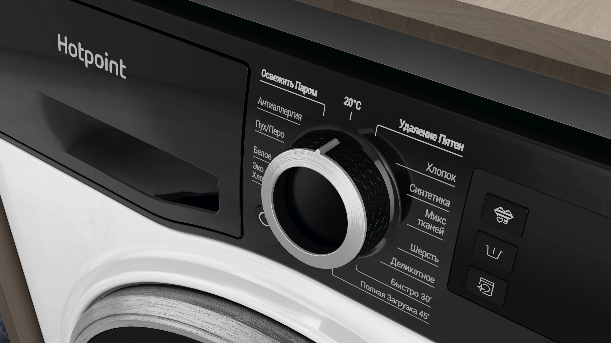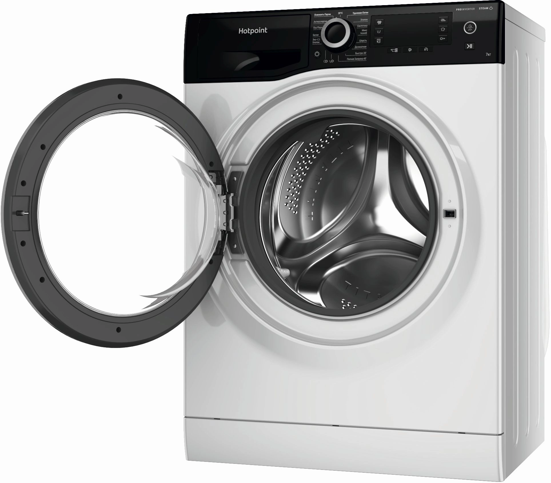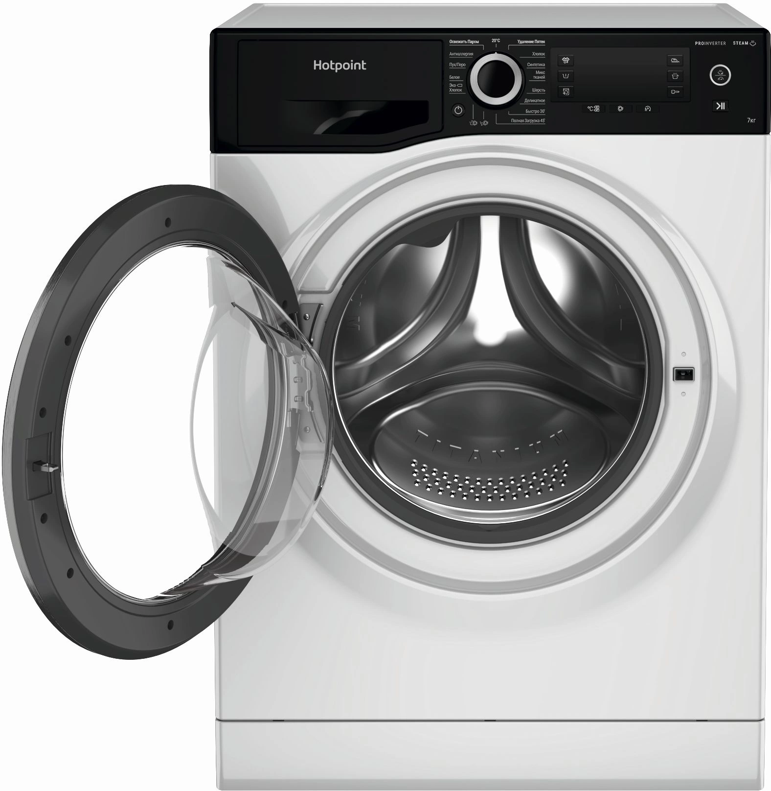 - ПрограммыОсвежить паром, 20°C, Удаление пятен, Хлопок, Синтетика, Микс тканей, Шерсть, Деликатное, Быстро 30’, Полная загрузка 45’, Антиаллергия, Пух/Перо, Белое, Эко Хлопок?