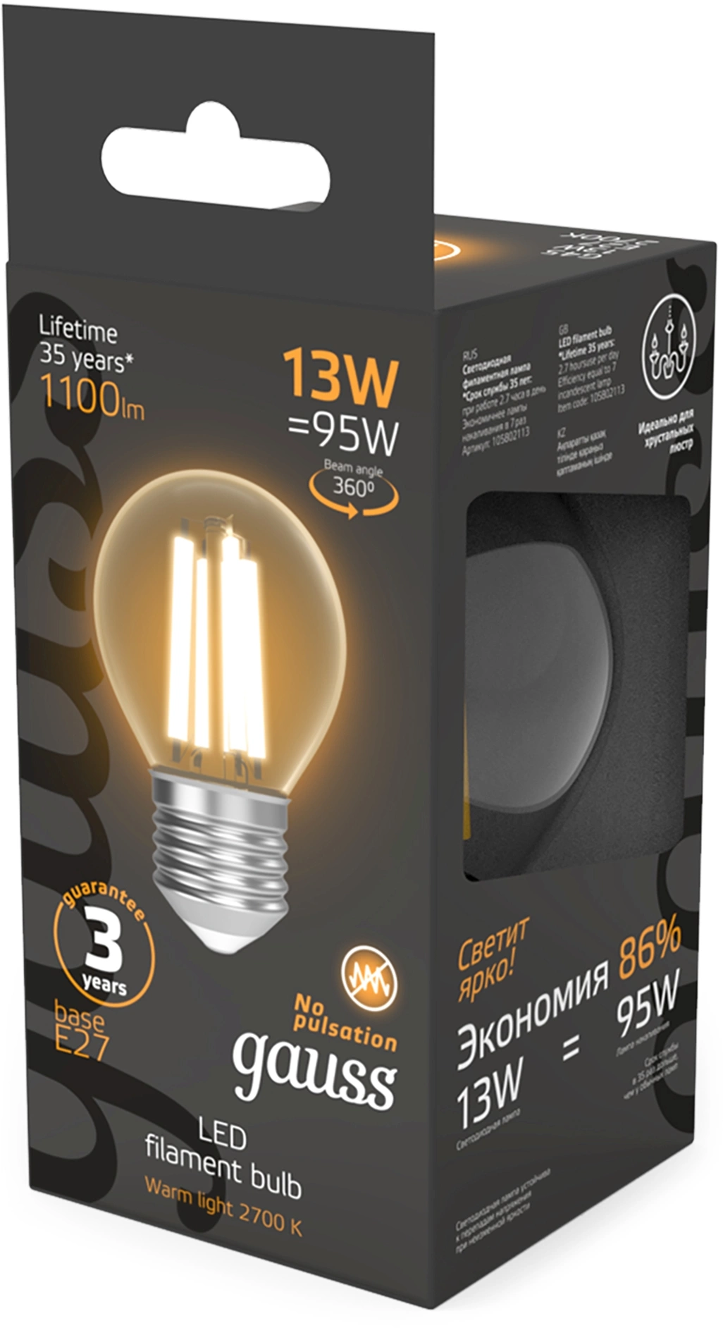 Лампа филам. Gauss Filament 13Вт цок.:E27 шар 220B св.свеч.бел.теп. (упак.:10шт) (105802113)