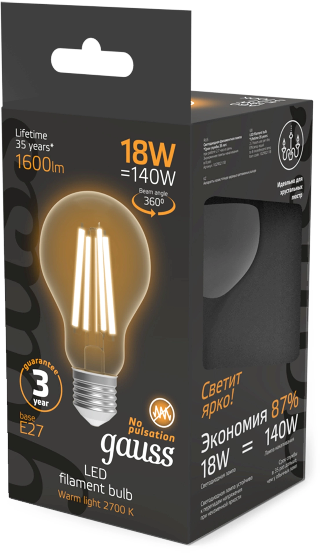 Лампа филам. Gauss Filament 18Вт цок.:E27 груша 220B св.свеч.бел.теп. (упак.:10шт) (102902118)