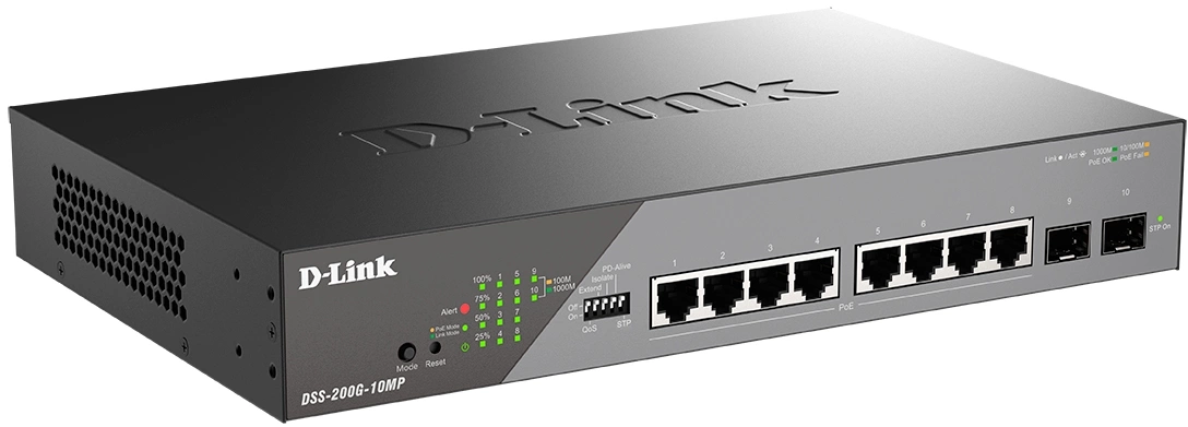 Коммутатор D-Link DSS-200G-10MP/A1A (L2) 8x1Гбит/с 2SFP 8PoE+ 130W настраиваемый