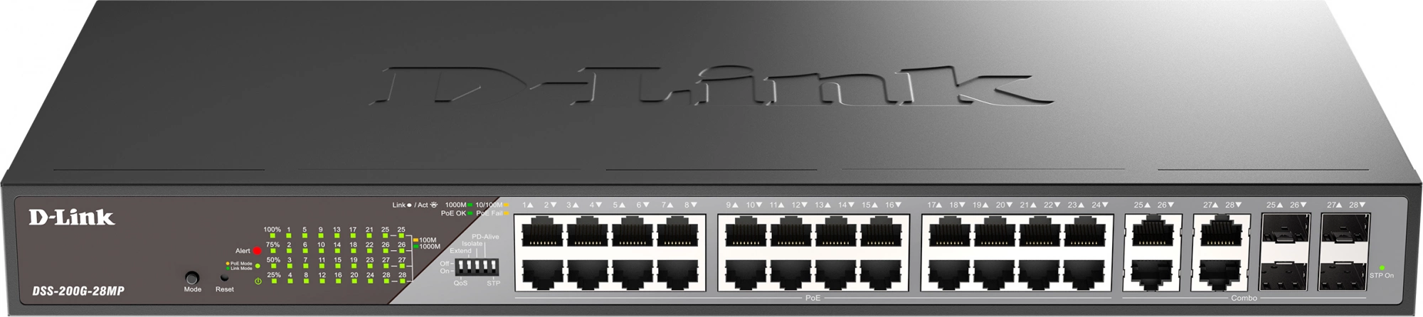 Коммутатор D-Link DSS-200G-28MP/A1A (L2) 24x1Гбит/с 4xКомбо(1000BASE-T/SFP) 24PoE 24PoE+ 370W настраиваемый