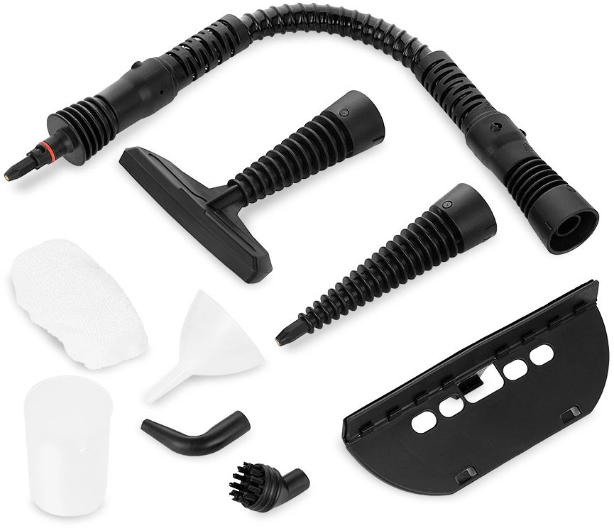 - Насадки в комплектеструйная насадка, угловая насадка, круглая нейлоновая щетка, паровой шланг, насадка для отпаривания, тряпка для отпаривания, насадка с резиновым скребком