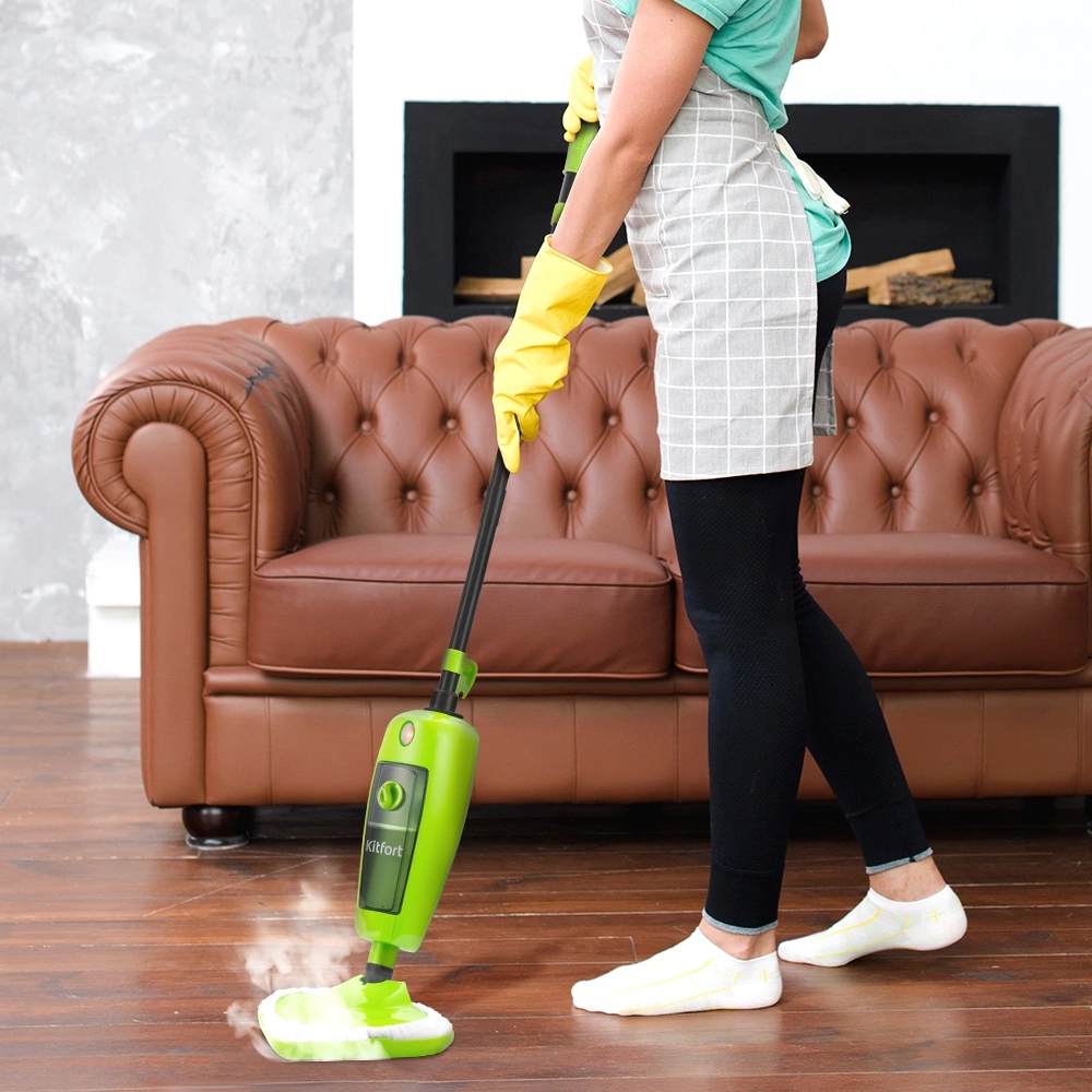 Паровая швабра КТ-1055 - это униварсальное устройство для уборки, которое поможет избавиться от пыли, грязи, жировых пятен с помощью струи пара, а также продезинфицирует обрабатываемую поверхность и уберёт неприятные запахи.