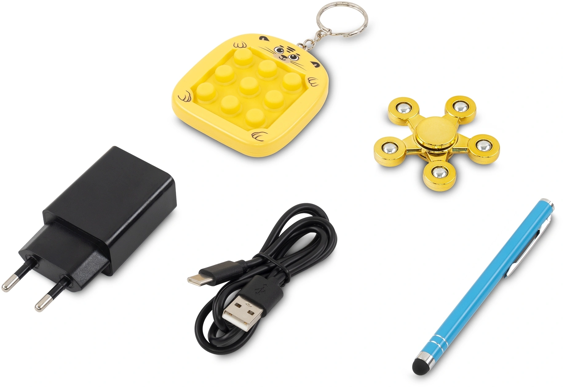 - Комплект поставкиСетевой адаптер питания; USB-C кабель; набор наклеек; стилус; спиннер; поп-ит игрушка
