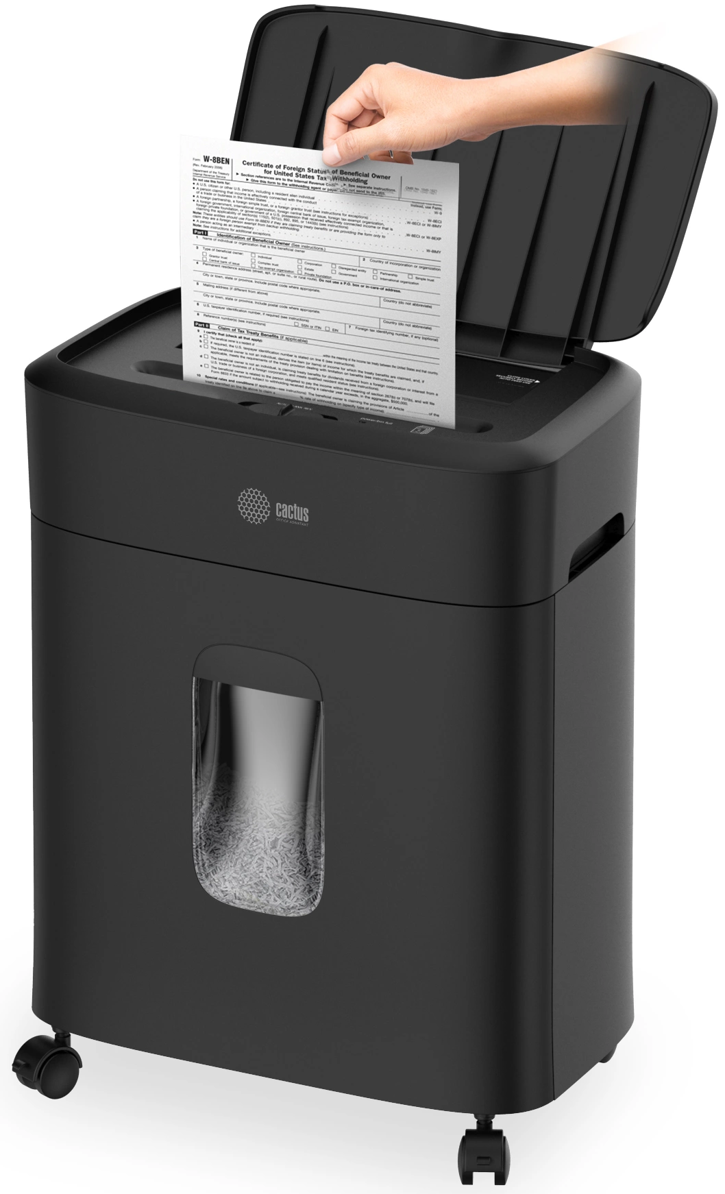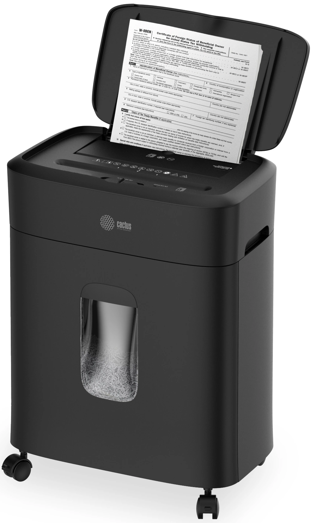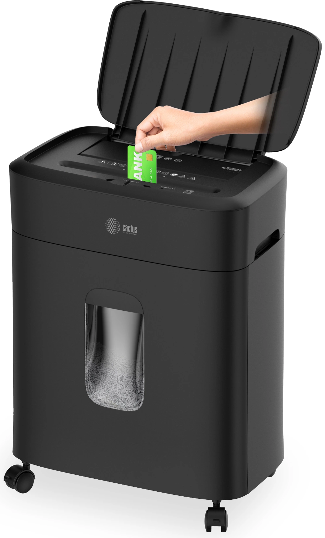 Шредер Cactus CS-SH-D4 черный с автоподачей (секр.P-5) фрагменты 60лист. 15лтр. скрепки скобы пл.карты