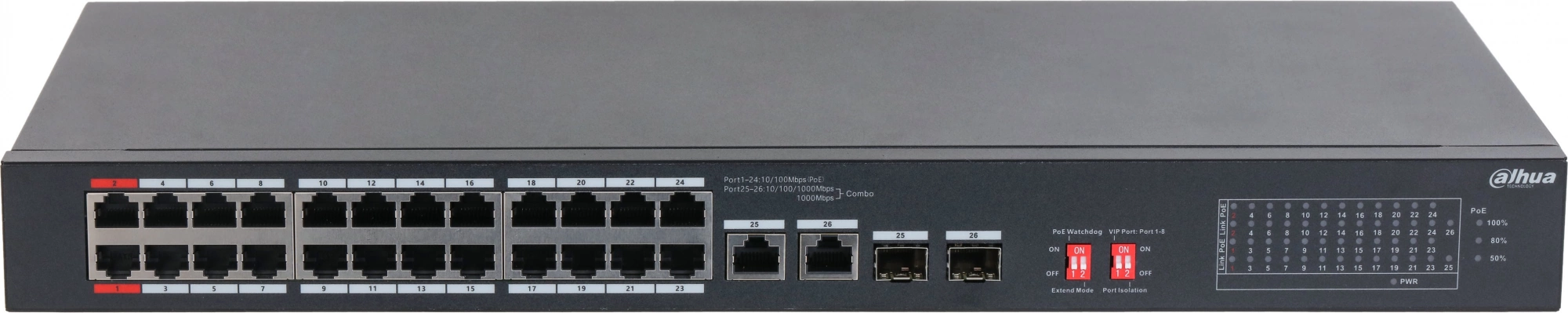 Коммутатор Dahua DH-S3226-24ET-240 (L2) 24x100Мбит/с 2xКомбо(1000BASE-T/SFP) 2SFP 24PoE неуправляемый