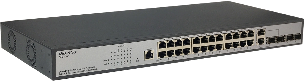 Коммутатор Origo OS3128P/250W OS3128P/250W/A1A (L2) 24x1Гбит/с 2xКомбо(1000BASE-T/SFP) 2SFP 24PoE+ 250W управляемый