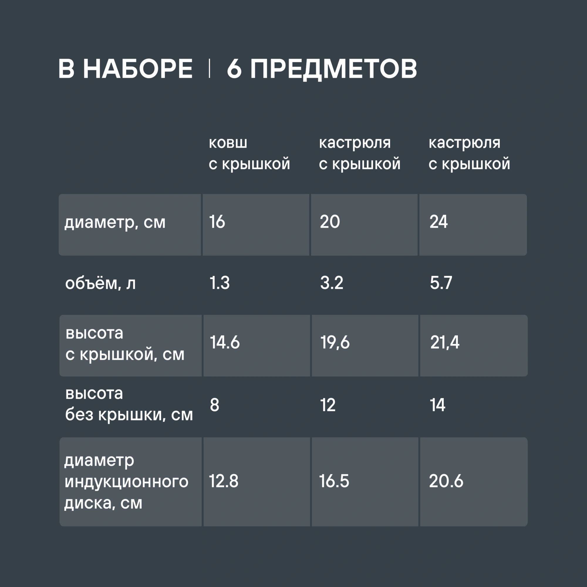 - Состав комплектаКовш 16 см (1,3 л), крышка 16 см, кастрюля с/кр. 20 см (3,2 л), кастрюля с/кр. 24 см (5,7 л)