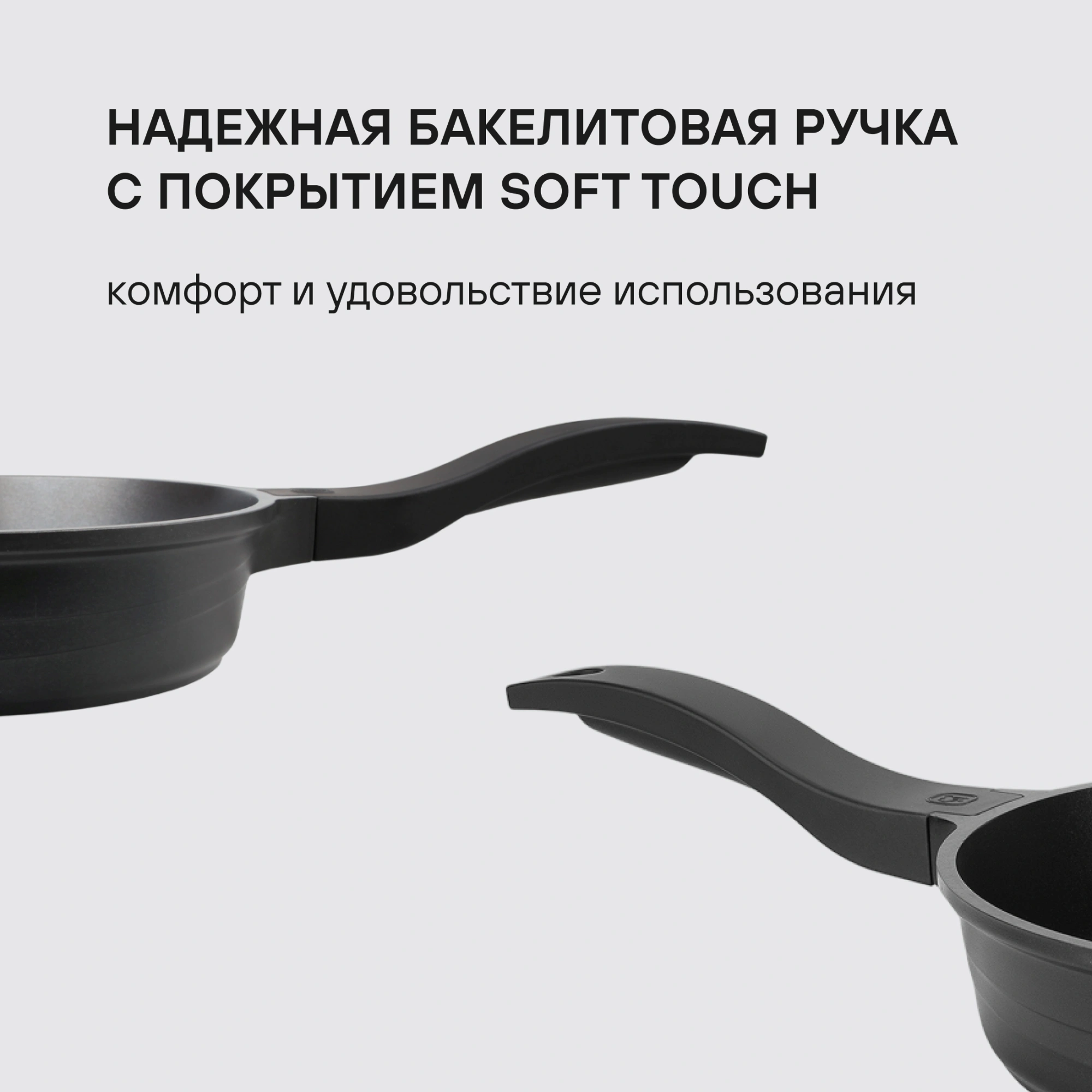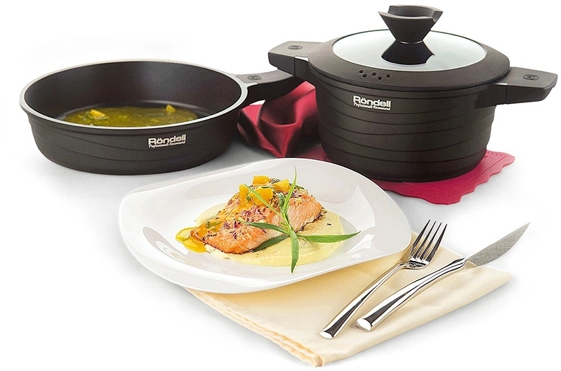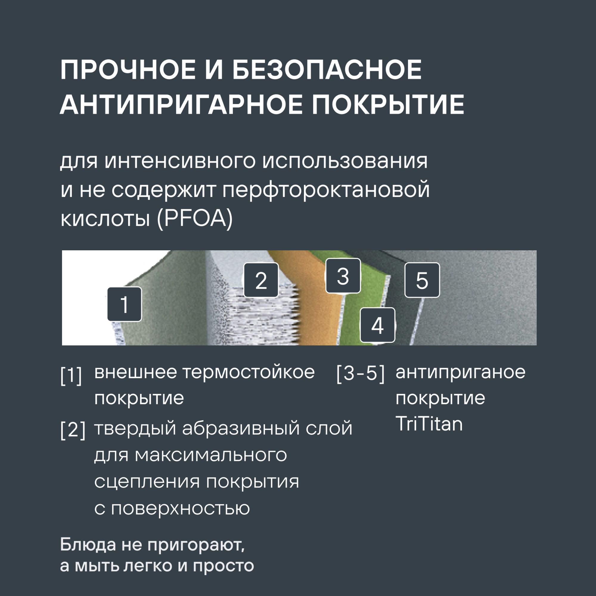 - ОсобенностиАксессуары: из бакелита с покрытием Soft Touch. Преимущества: удобный хват; возможно использование металлических лопаток; TriTitan® - внутреннее трехслойное, износостойкое антипригарное покрытие на основе титана. Упаковка: подарочная упаковка с отверстиями для аксессуаров.