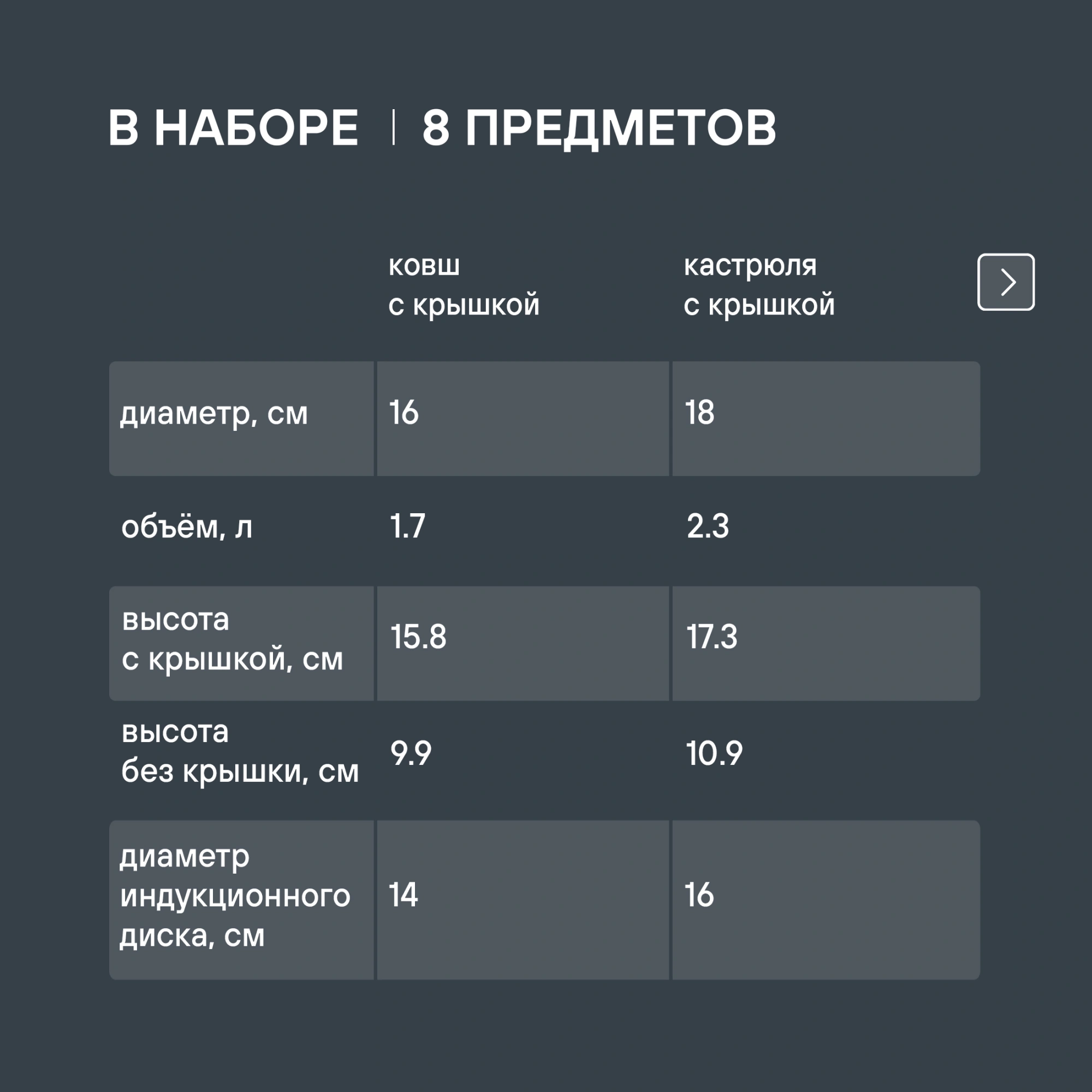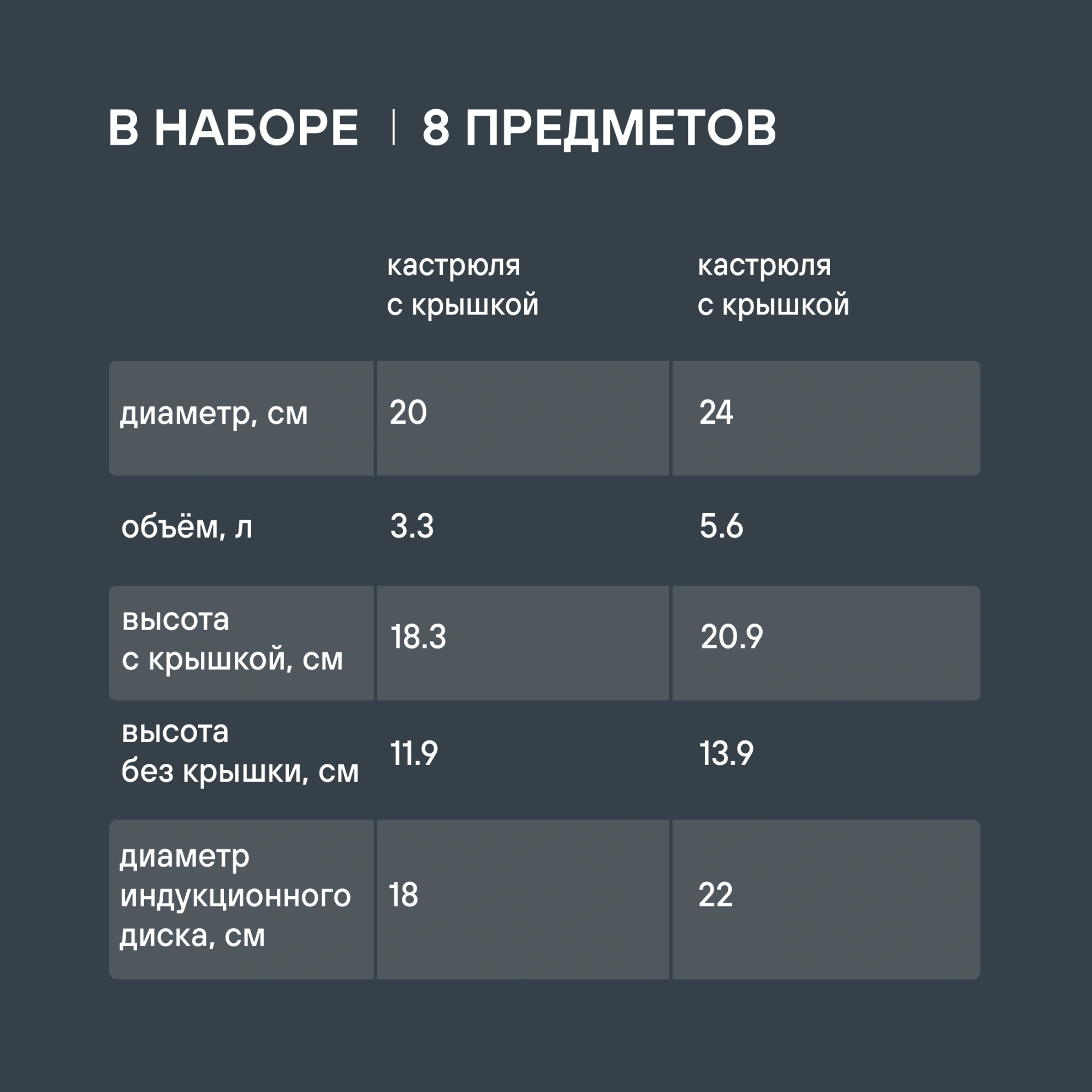 - Состав комплектаТри кастрюли 18 см (2,3 л), 20 см (3,3 л), 24 см (5,6 л), ковш 16 см (1,7 л), со стеклянными крышками