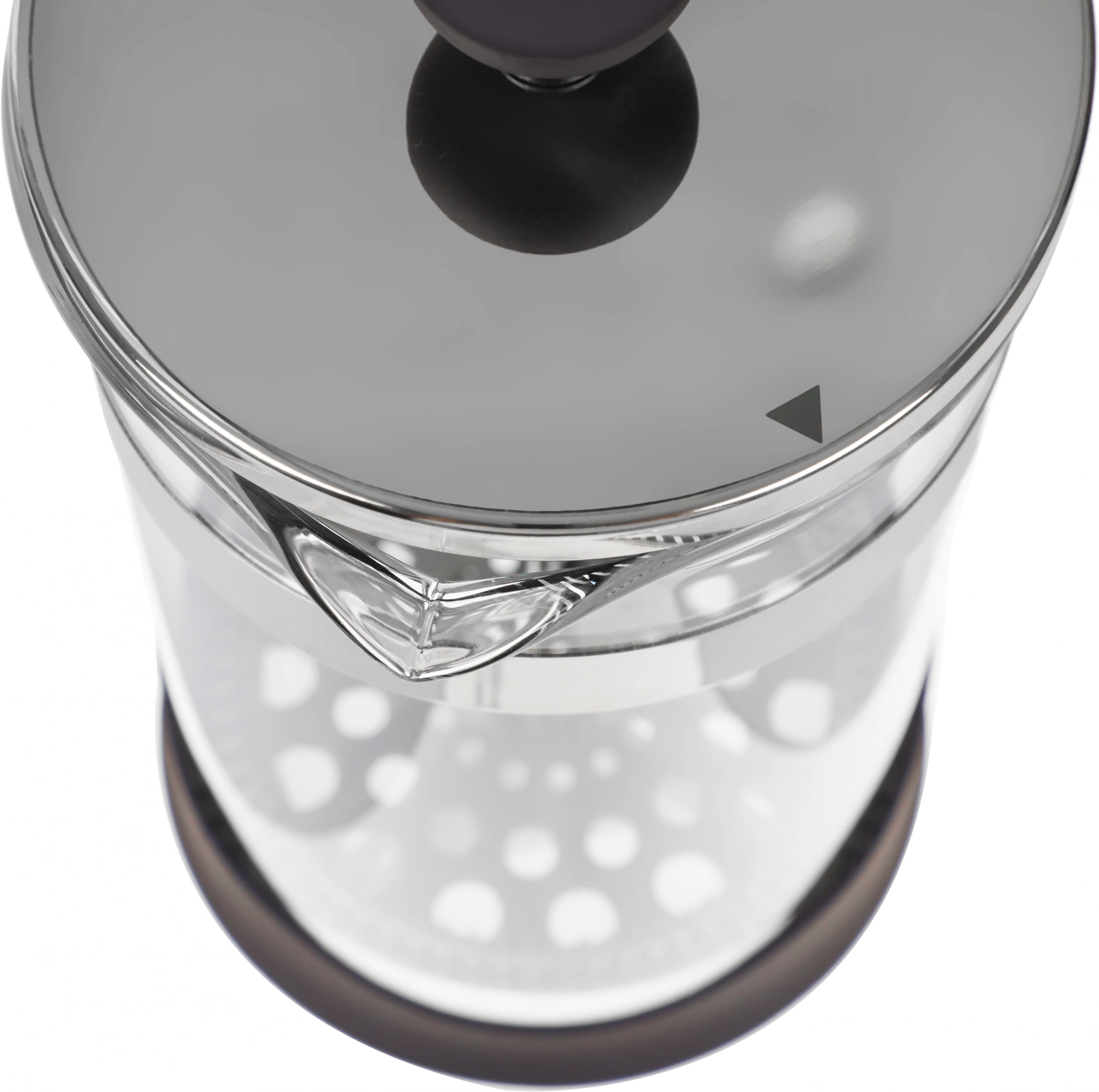 Колба Френч-прессов Akzent изготовлена из высококачественного термостойкого стекла, а держатель из АВС-пластика черничного цвета и нержавеющей стали. Для комфорта в использовании на крышке значок, который «подскажет», где фильтр слива. В коллекции две модели — объемом 1 л и 0,6 л.