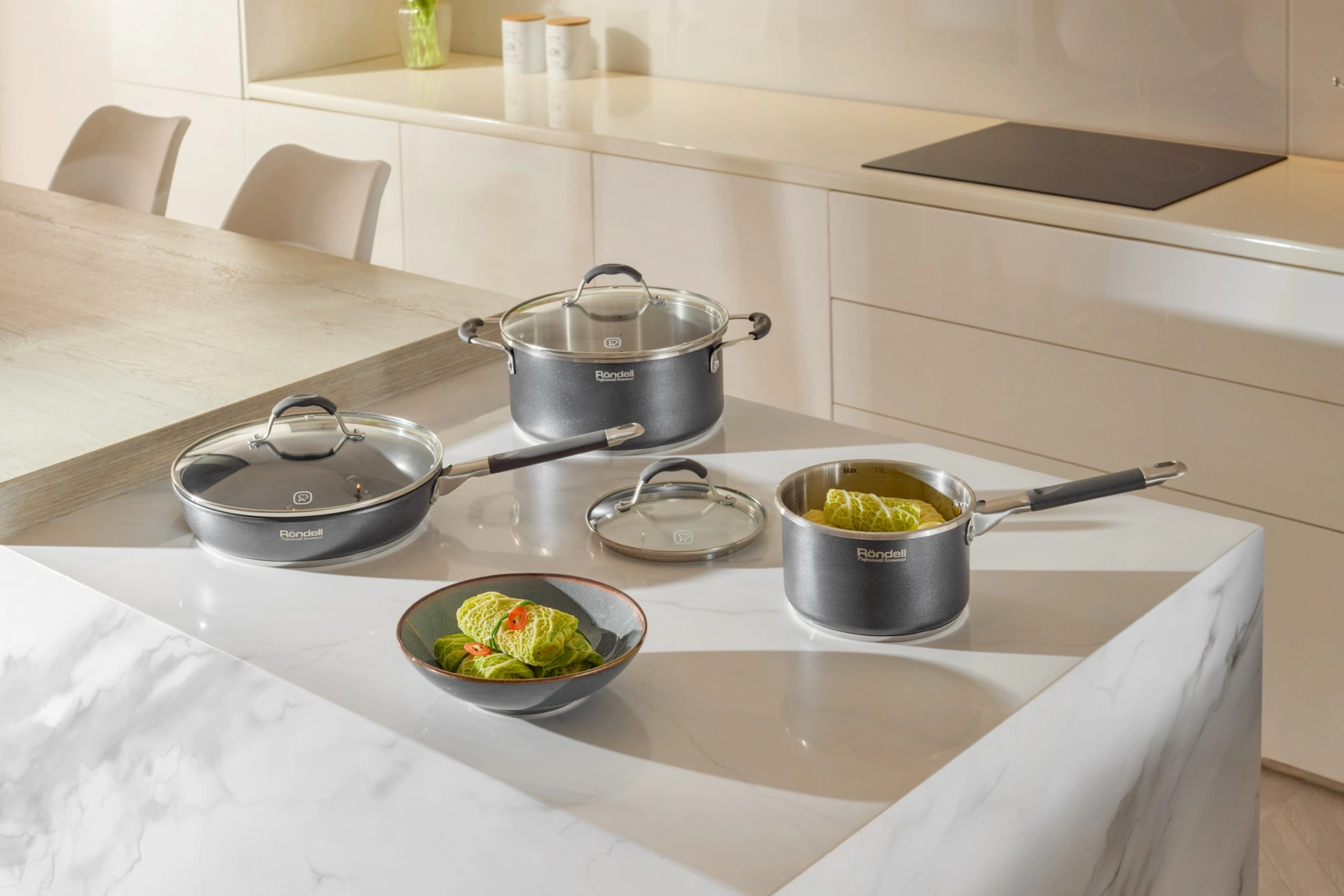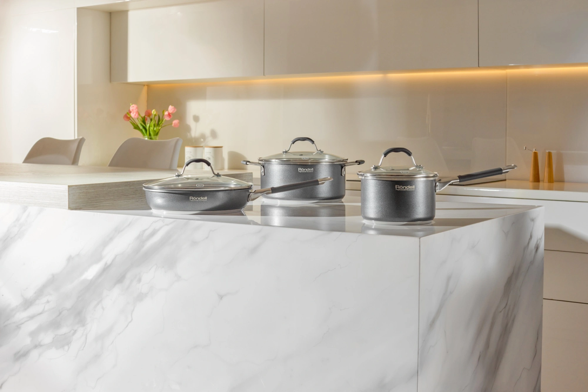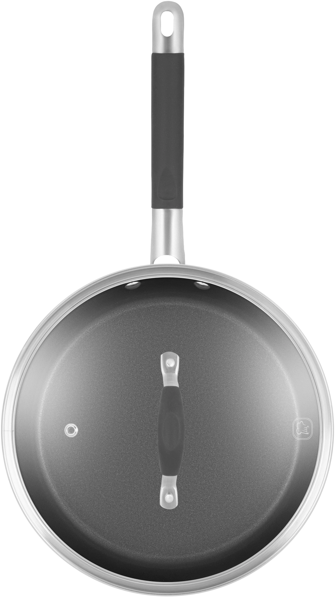 - ОсобенностиТехнология: тройное вштампованное, а затем вплавленное дно без воздушных полостей. Аксессуары: удобные комбинированные: нержавеющая сталь и силикон. Преимущества: возможно использование металлических лопаток. Упаковка: подарочная коробка с ручкой.