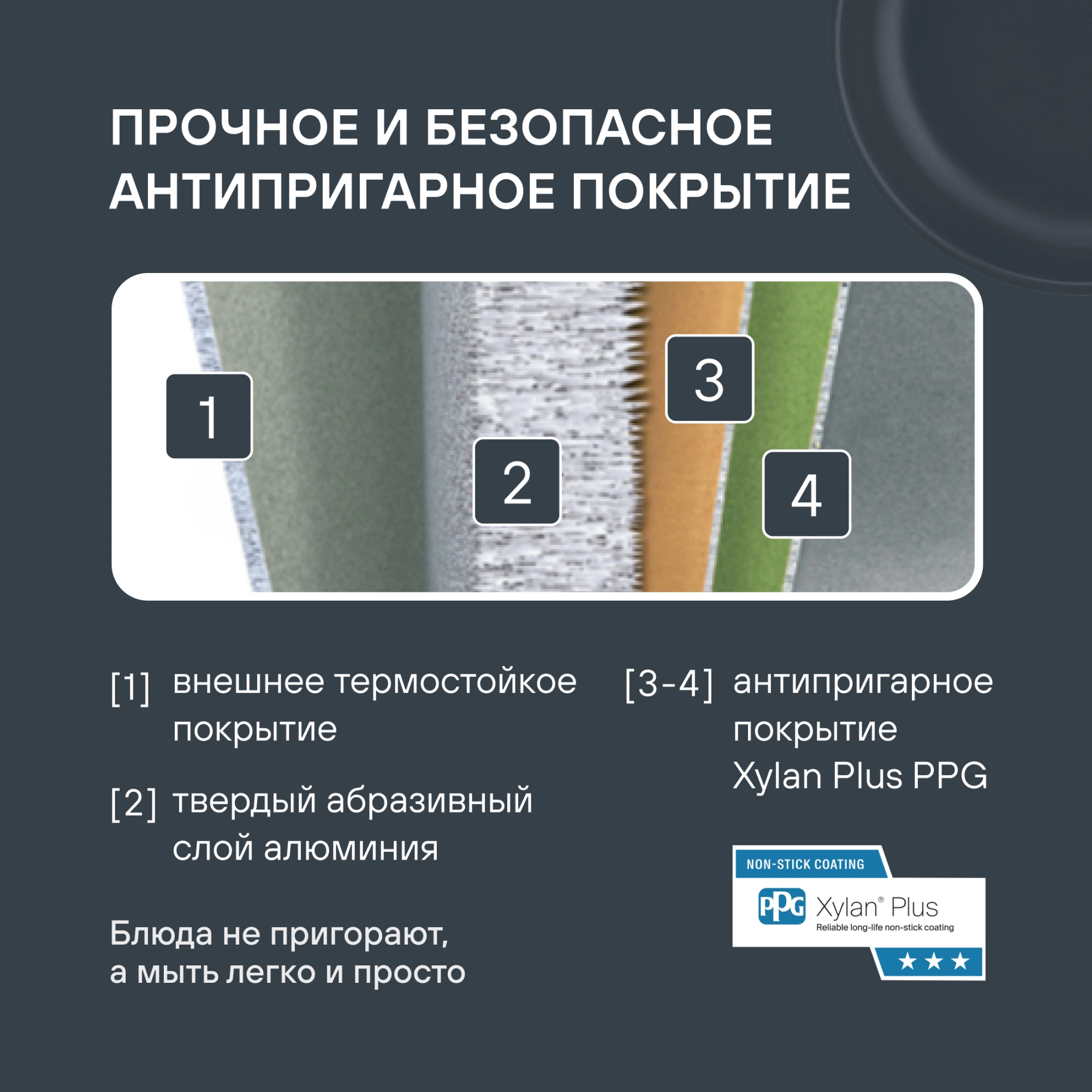 - ОсобенностиАксессуары: эргономичные бакелитовые ручки с soft touch покрытием и силиконовыми вставками, препятствующими скольжению. Преимущества: специальное внешнее термостойкое покрытие для легкого ухода; Xylan® Plus – двухслойное, долговечное антипригарное покрытие для интенсивного использования.