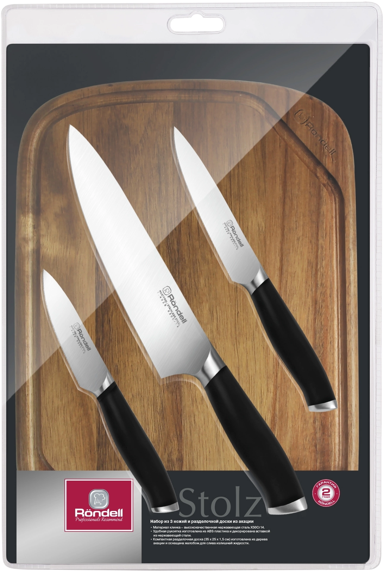 Название Stolz (в переводе с немецкого «гордость») обусловлено выдающимися техническими характеристиками посуды и эффектным дизайном. В комплекте: поварской нож 20 см, универсальный нож 12,7 см и нож для чистки овощей 9 см + разделочная доска из акации (35х25х1,5 см)