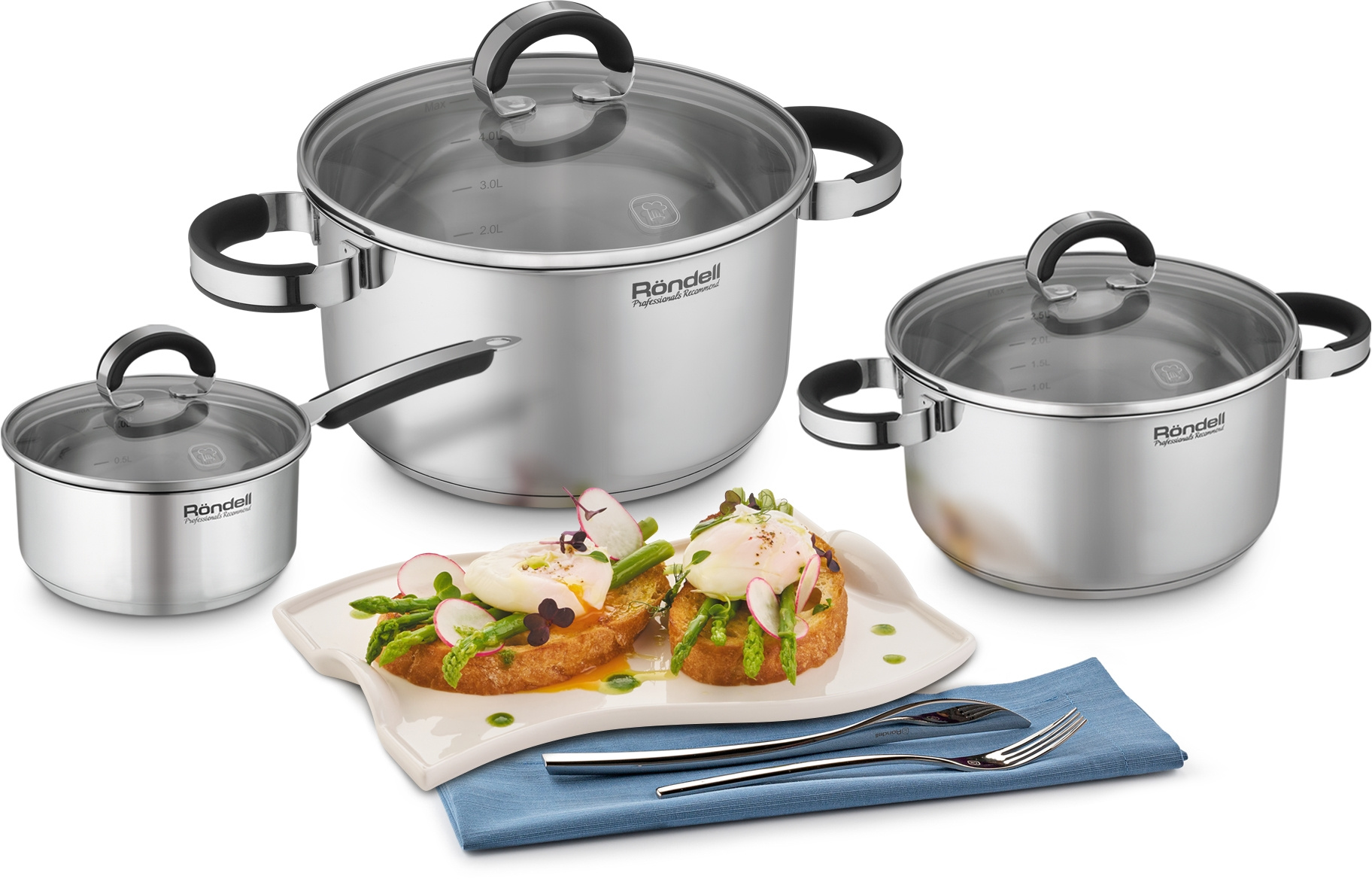 Обратите внимание на ковш коллекции Brando. Крышка из термостойкого стекла с отверстием для выпуска пара и стальным ободком для предотвращения сколов. Подходит для всех видов плит, включая индукционные. Подходит для посудомоечной машины при условии использования неагрессивных моющих средств. - БрендRONDELL