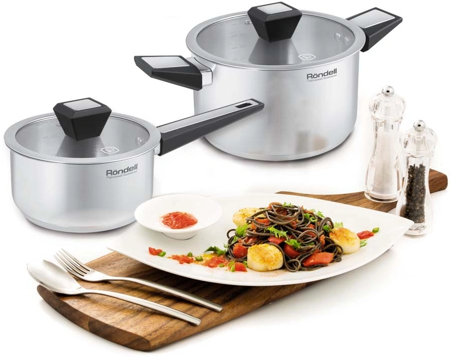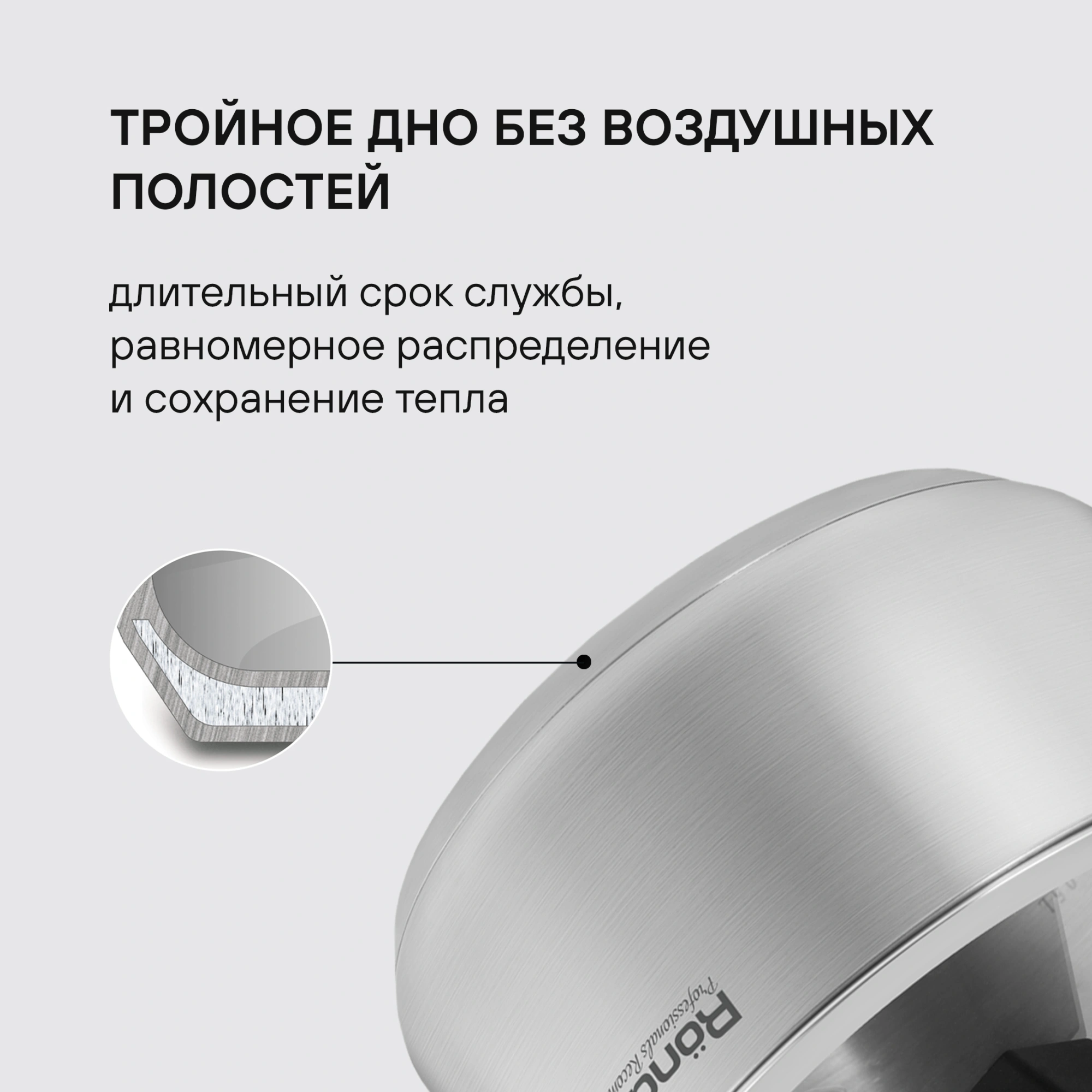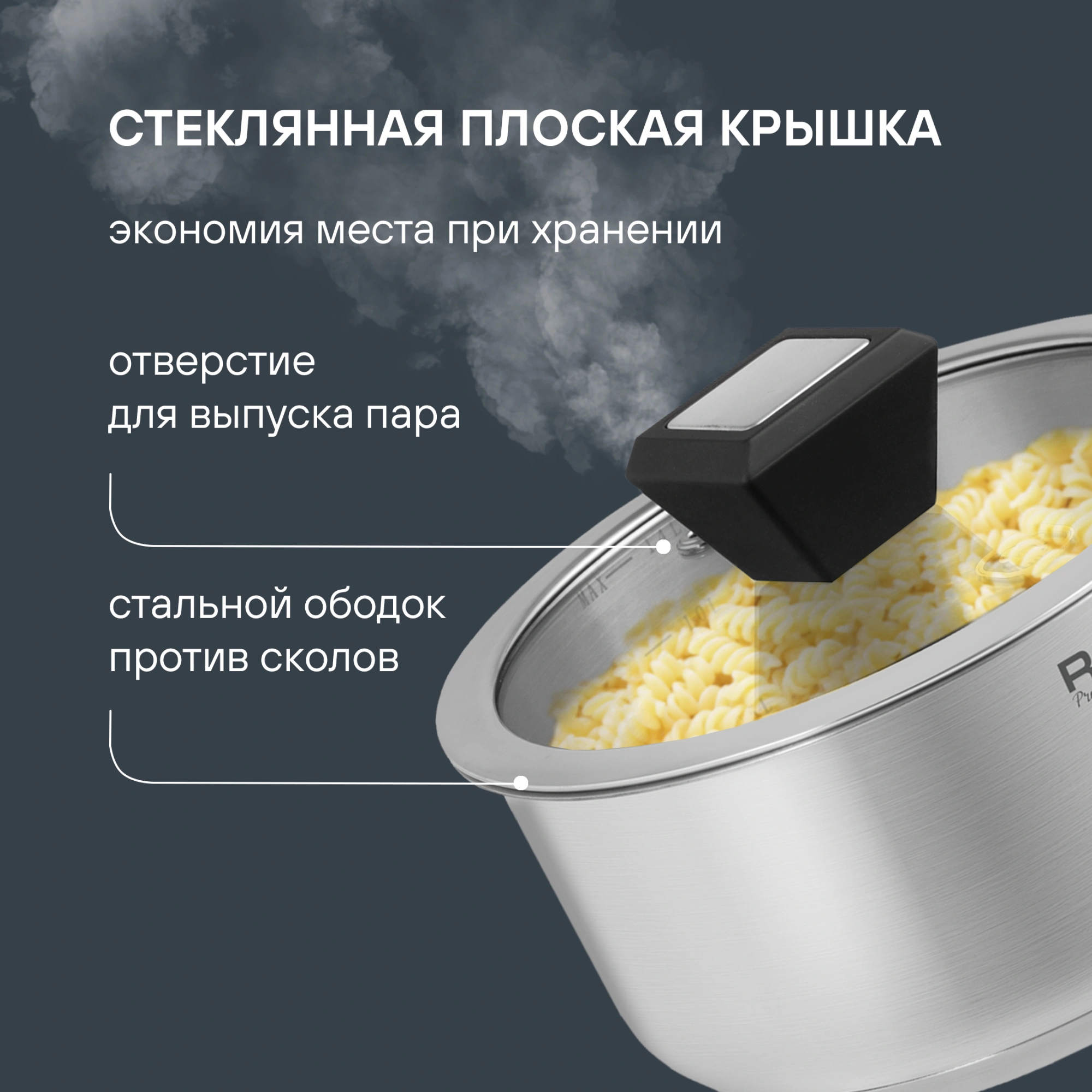 - ОсобенностиТехнология: тройное вштампованное, а затем вплавленное дно без воздушных полостей. Аксессуары: стильные бакелитовые ручки со стальными вставками. Преимущества: эргономичная форма ручек. Плоская крышка из термостойкого стекла с паровыпуском и широким металлическим ободом.