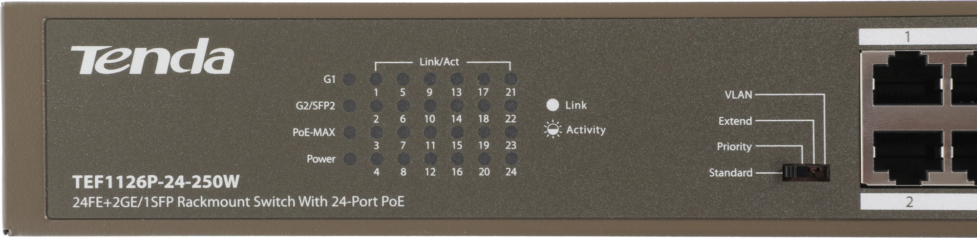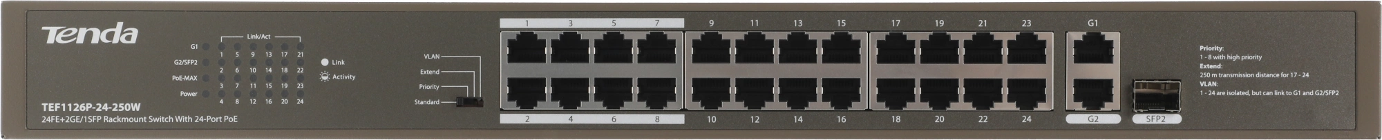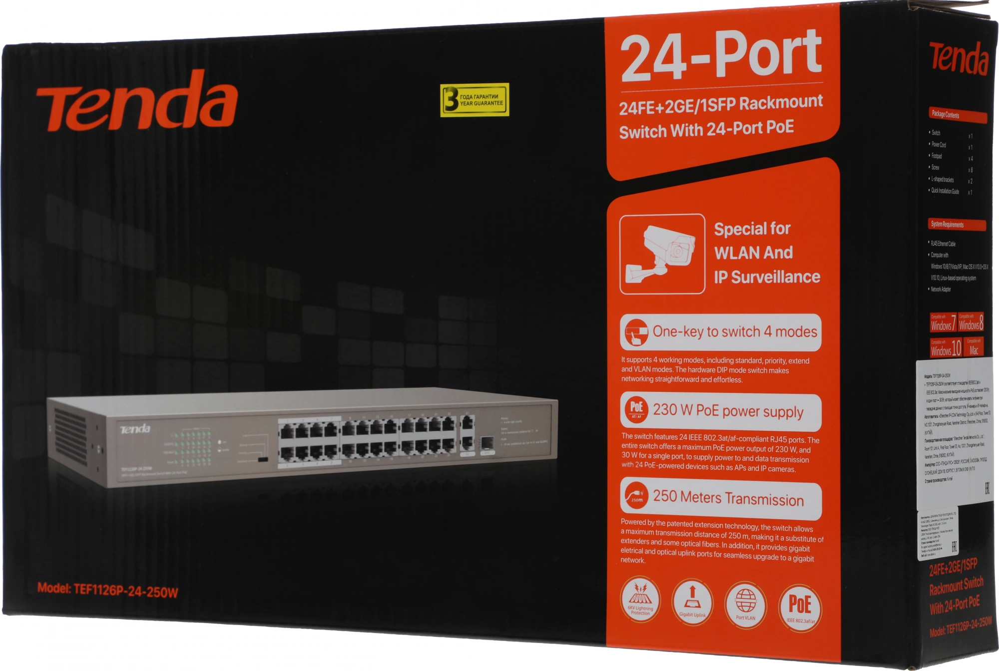 Коммутатор Tenda TEF1126P-24-250W (L2) 24x100Мбит/с 2x1Гбит/с 1SFP 24PoE 230W неуправляемый