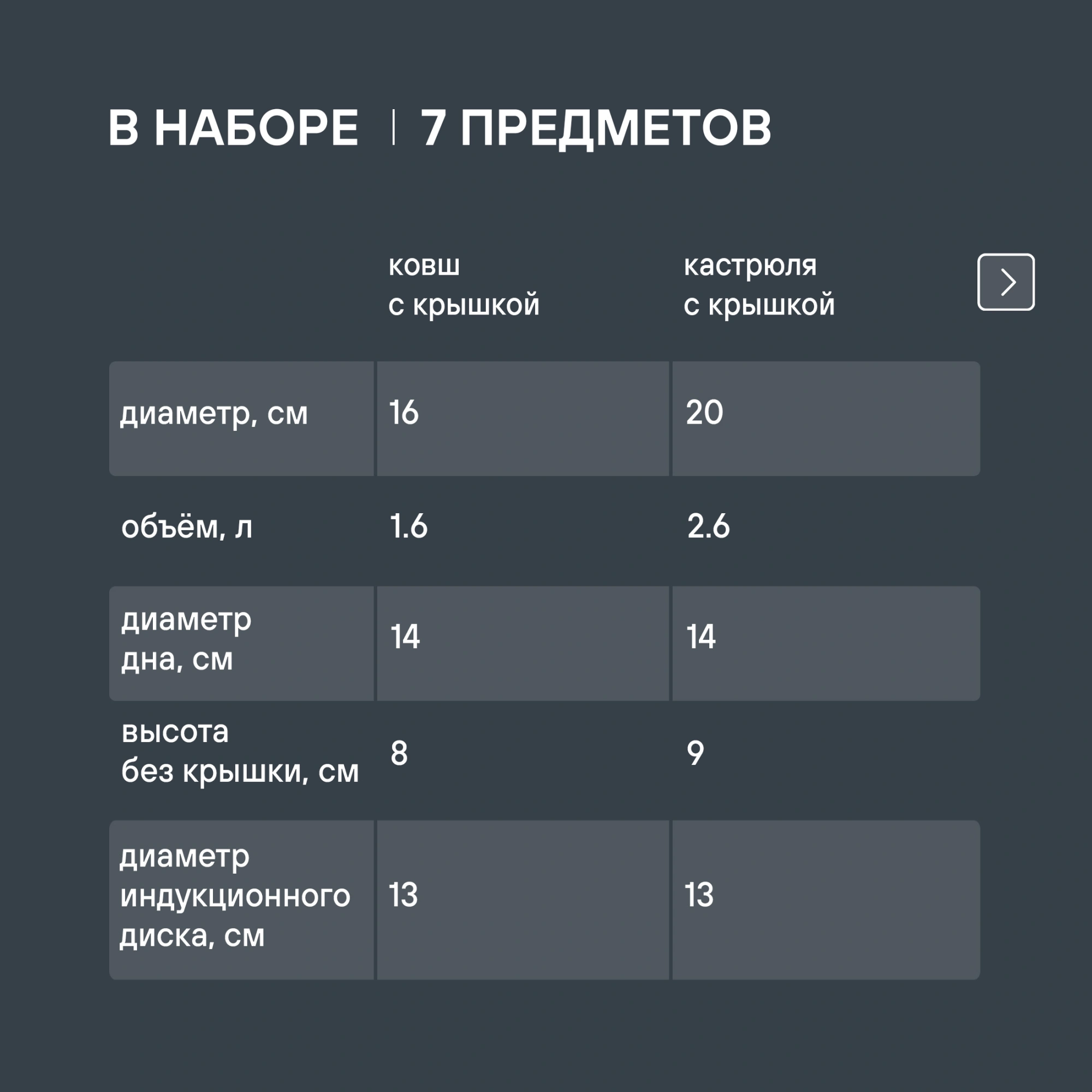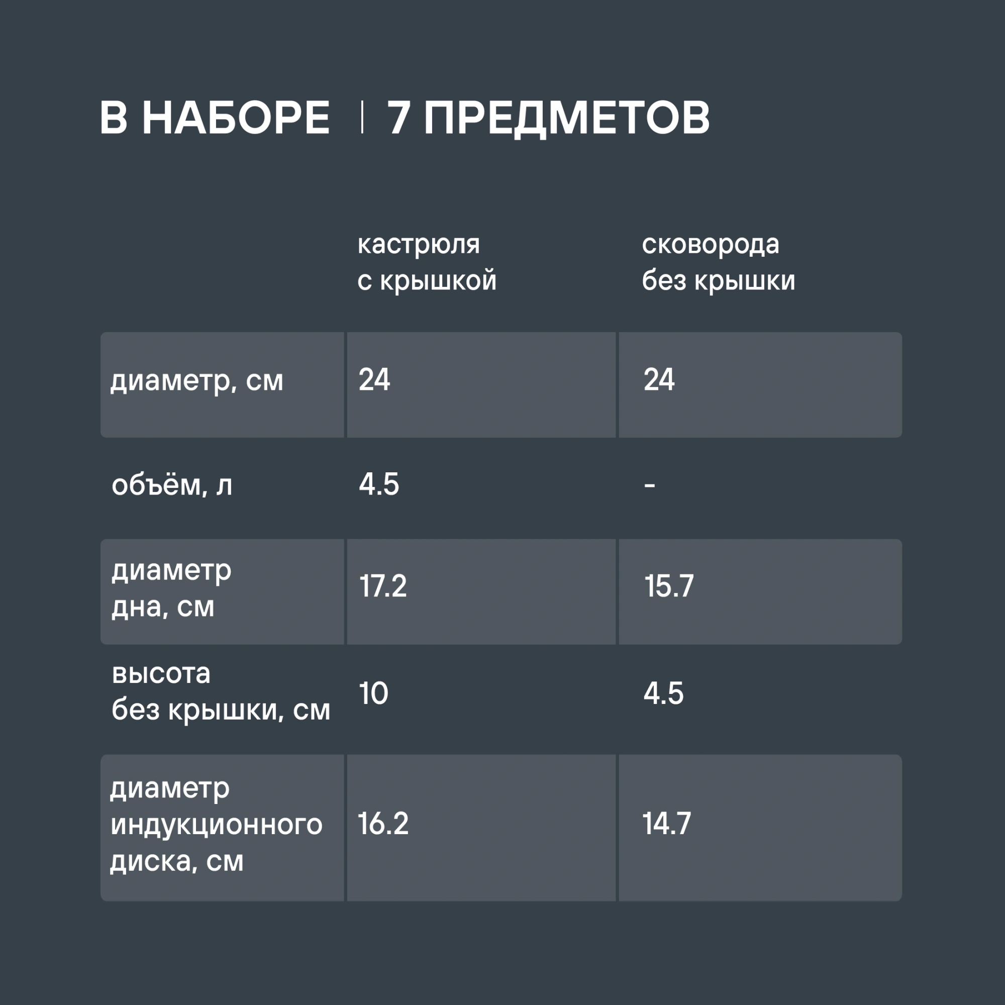 - Состав комплектаКовш 16х8см, кастрюли 20х9см, 24х10,5см, c крышками, сковорода 24х4,5 см