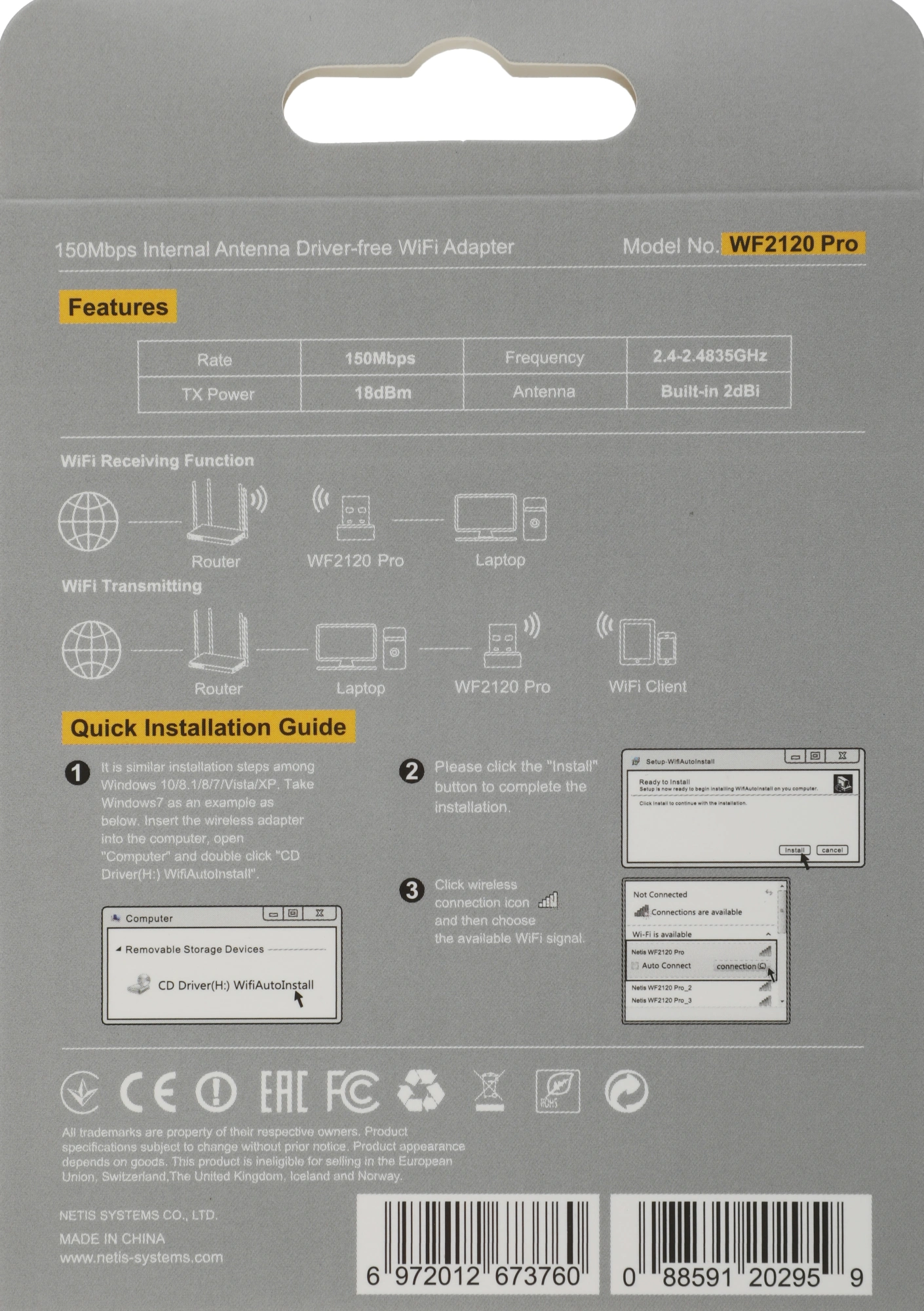 Сетевой адаптер Wi-Fi Netis WF2120 Pro N150 USB 2.0 (ант.внутр.) 1ант.