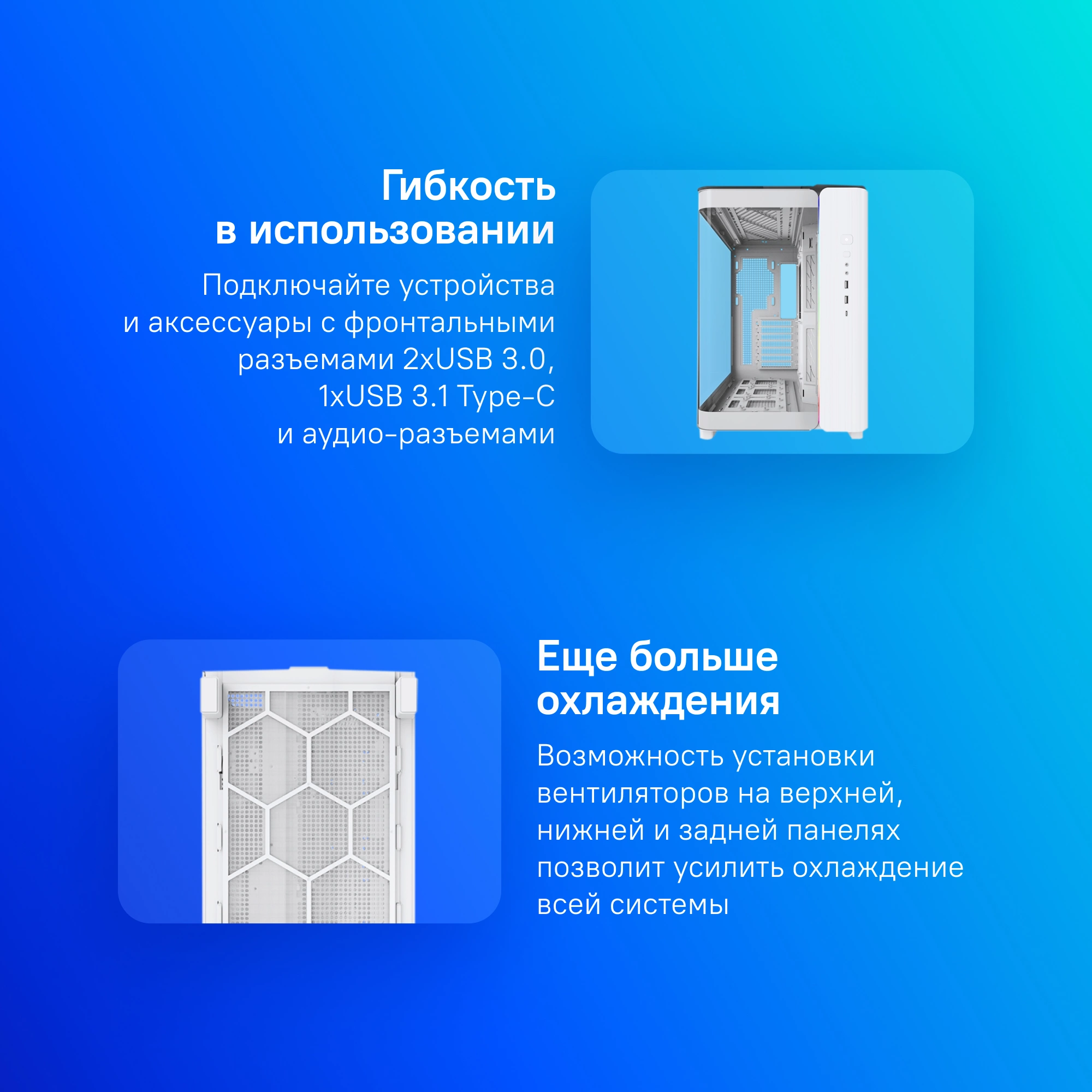 - Возможность установки доп. вентиляторов на боковой панели2x120 мм или 2x140 мм