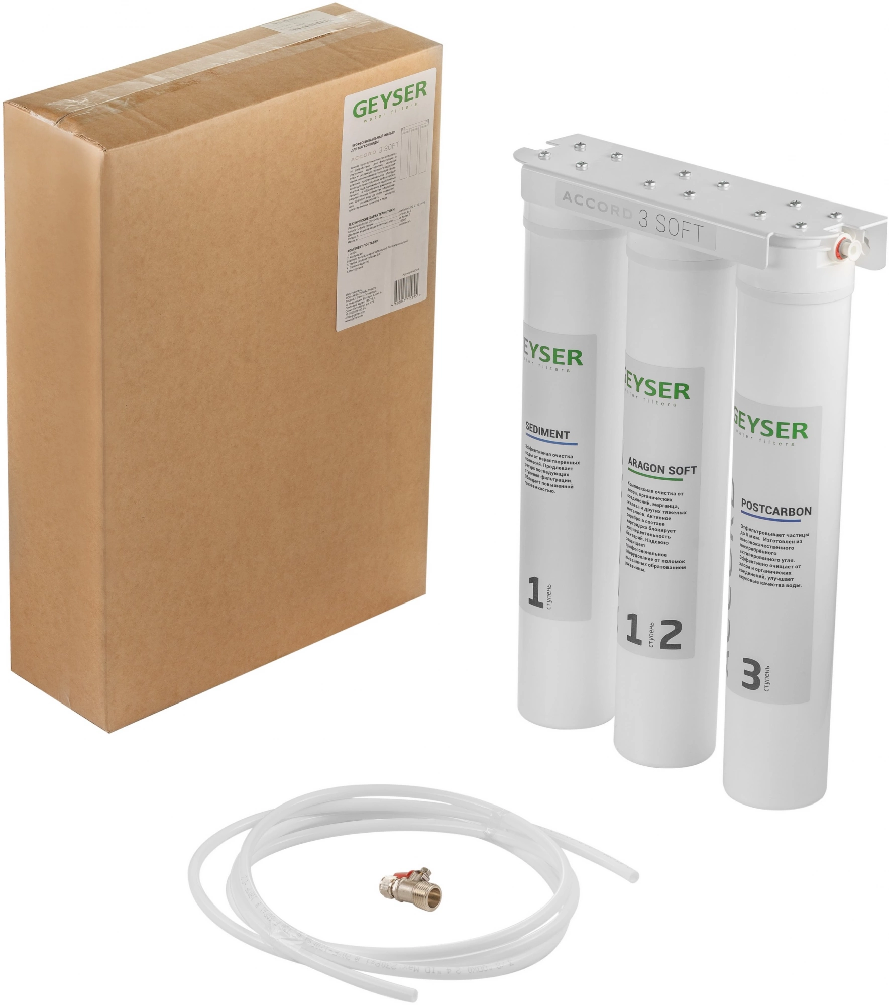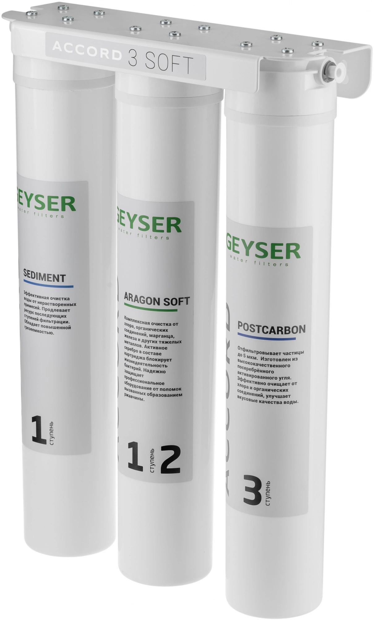 - КомплектацияСкоба металлическая (1 шт.) Картриджи (3 шт.): Sediment Accord, Aragon Soft Accord, Postcarbon Accord Трубка соединительная 3/8” (1 шт.) Тройник-адаптер (1 шт.) Инструкция (1 шт.) Упаковка (1 шт.) Саморез (4 шт.)