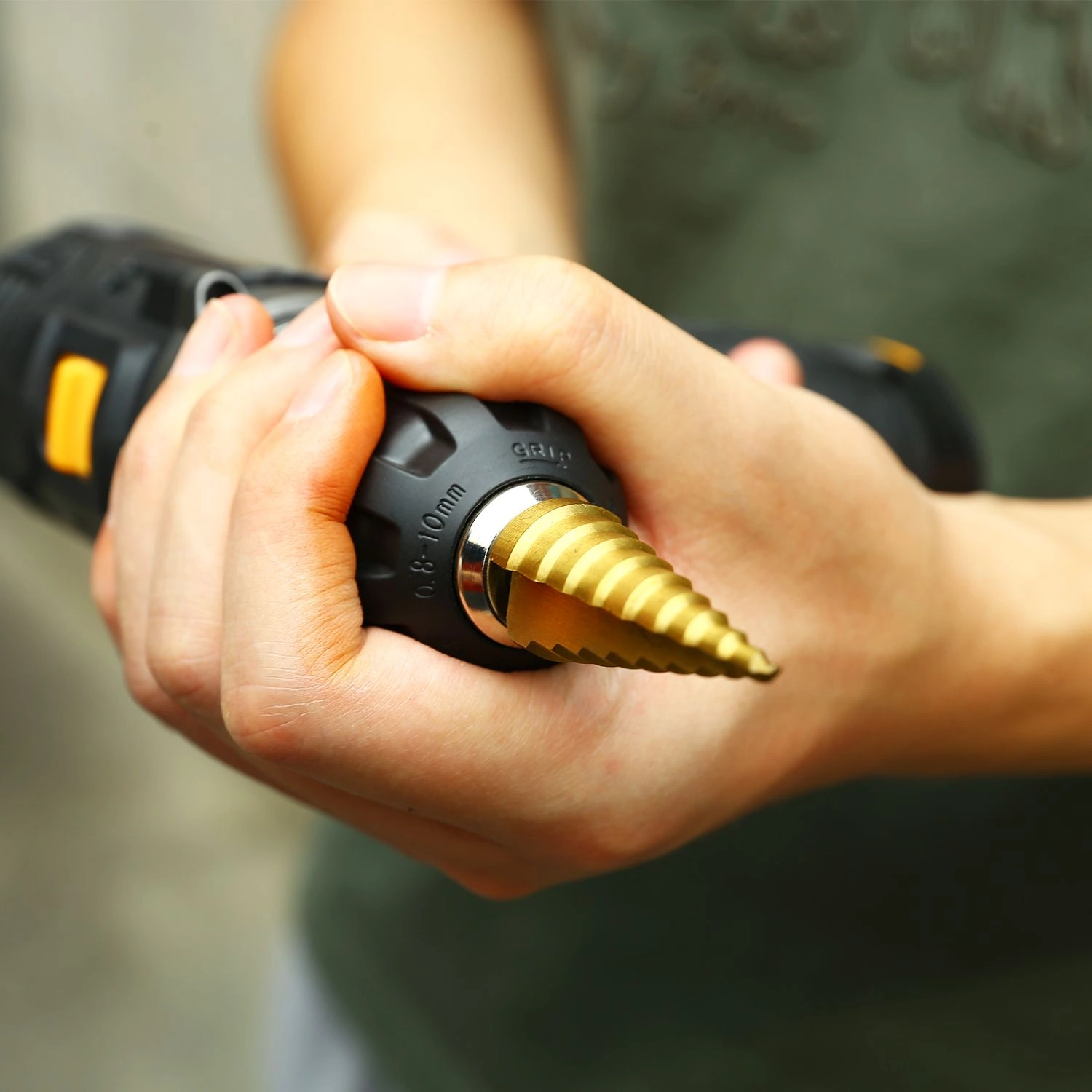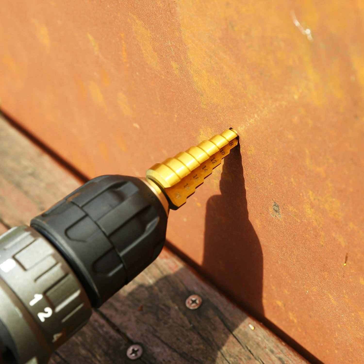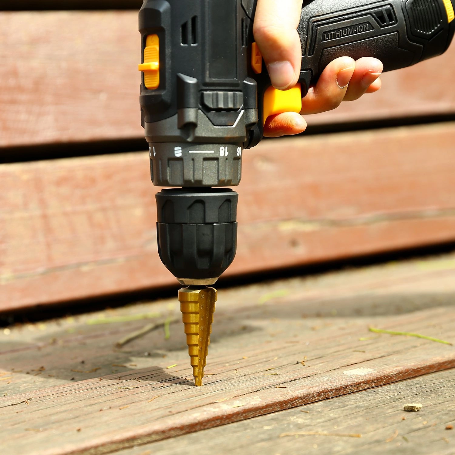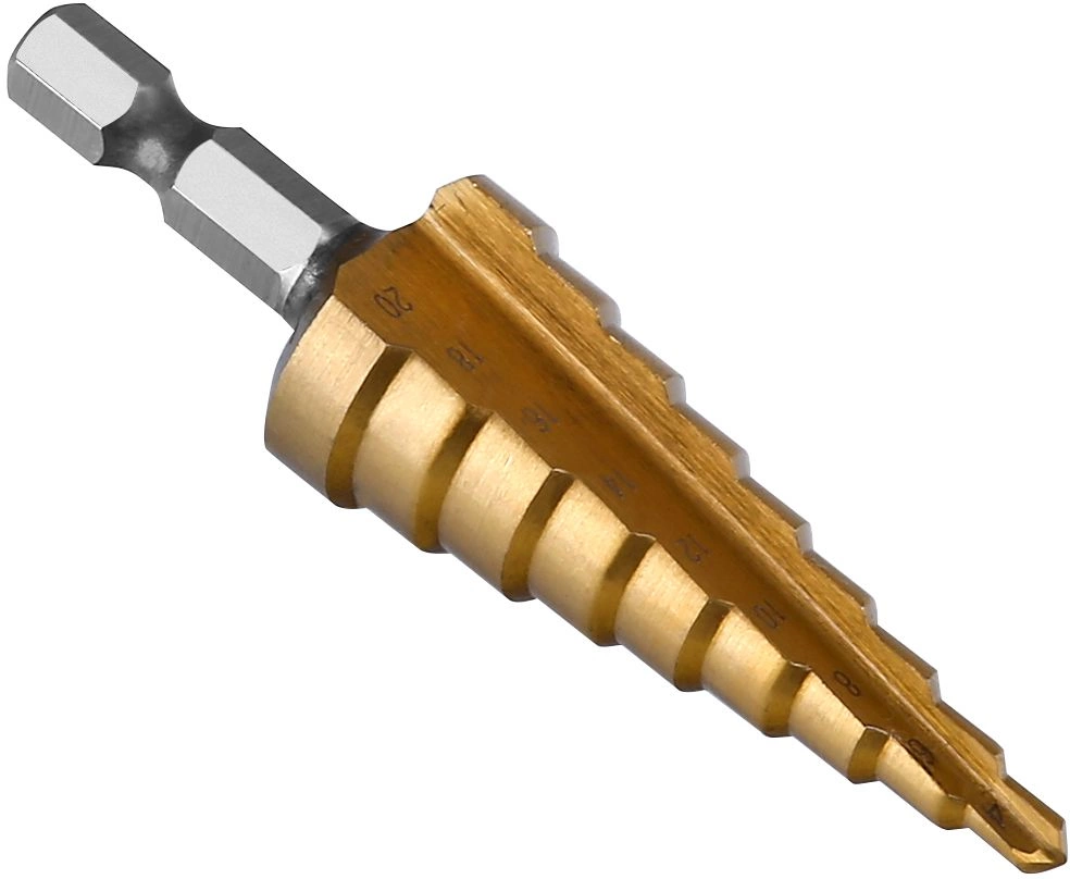 Cверло ступенчатое DEKO DH23 из быстрорежущей стали (HSS) с покрытием из нитрида титана для увеличения срока службы. Идеально подходит для сверления отверстий в изделиях из цветных металлов, пластика и стальных листах. Каждый следующий размер имеет плавный переход в виде ступеньки.