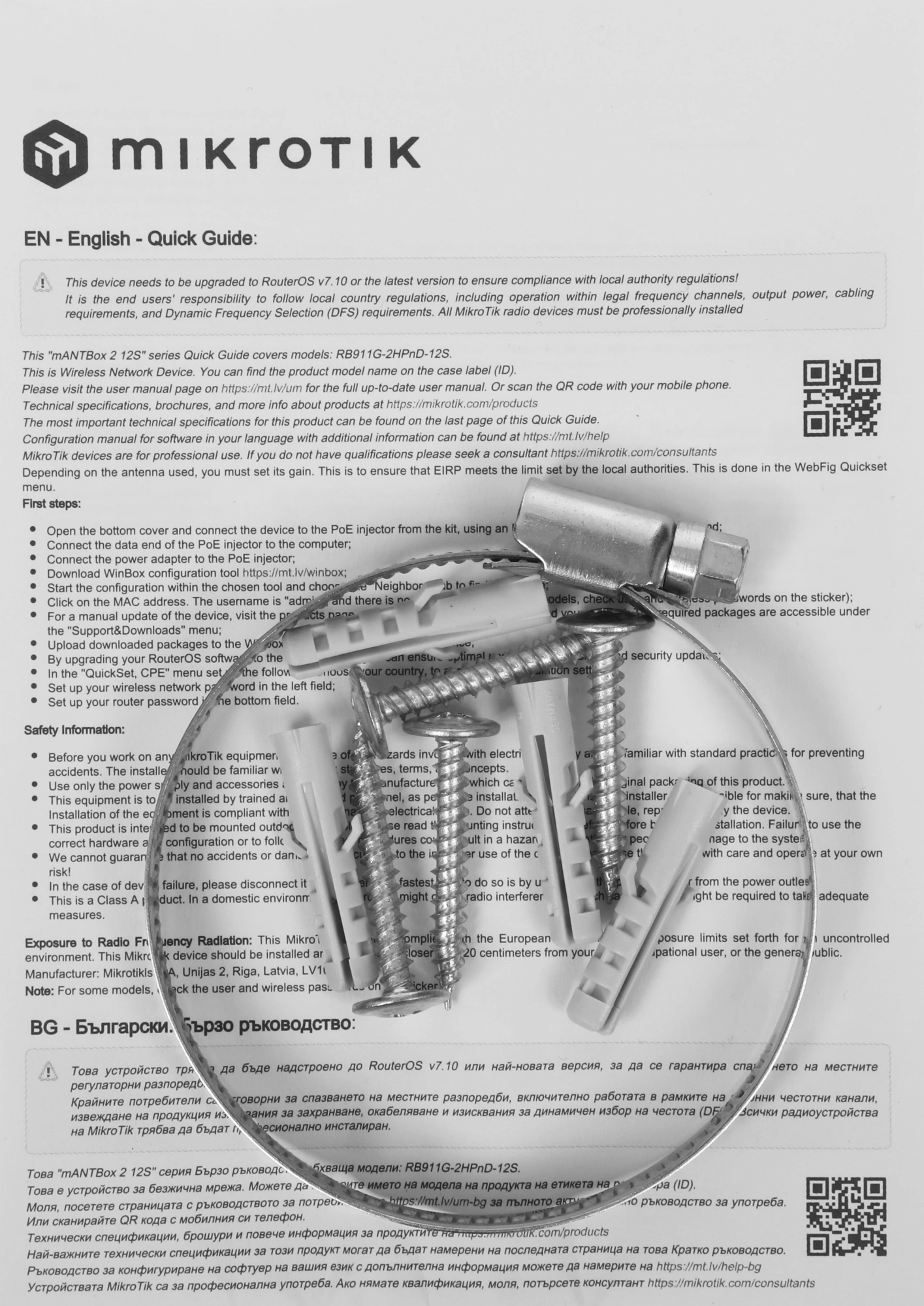 - КомплектацияБазовая станция, гигабитный PoE-инжектор, блок питания 24 В, 0.8 А, металлический хомут для установки на мачту, набор винтов К-41, крепление quickMOUNT pro.
