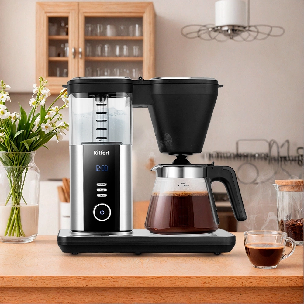 Капельная кофеварка КТ-7213 готовит ароматный чёрный кофе из молотого кофе. Она компактная с простой и удобной панелью управления. Идеально подойдёт для приготовления кофе в домашних условиях или в офисе. Вы можете выбрать приготовление кофе со льдом.