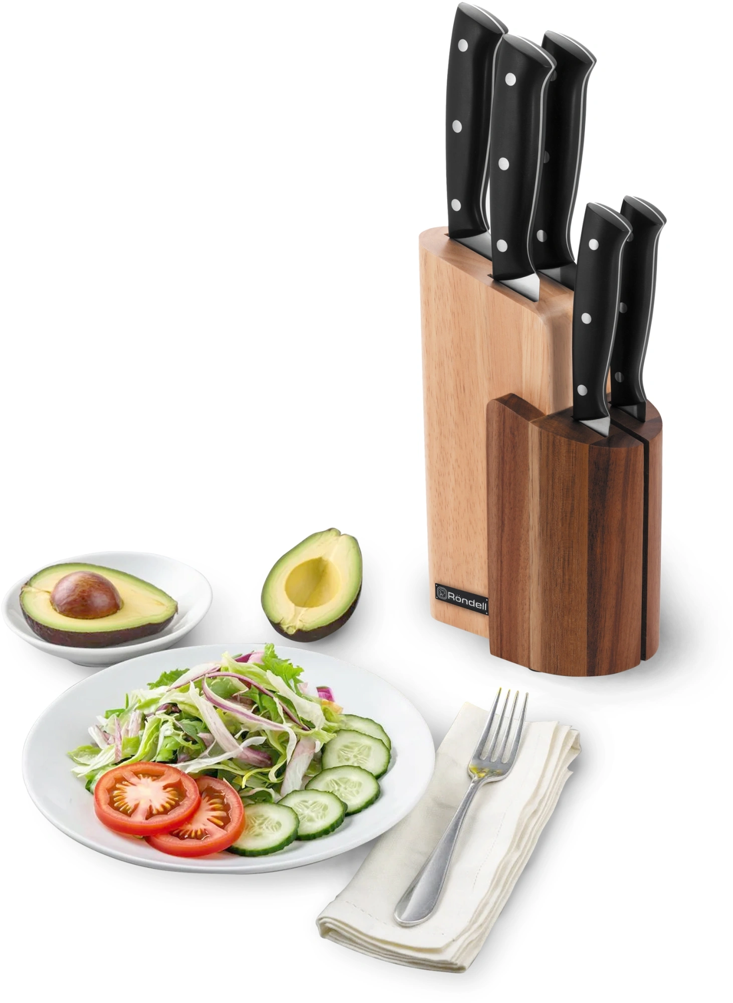 - Состав комплектаНож поварской 20 см, нож разделочный 20 см, нож для хлеба 20 см, нож универсальный 12,7 см и нож для чистки овощей 9 см, деревянный блок